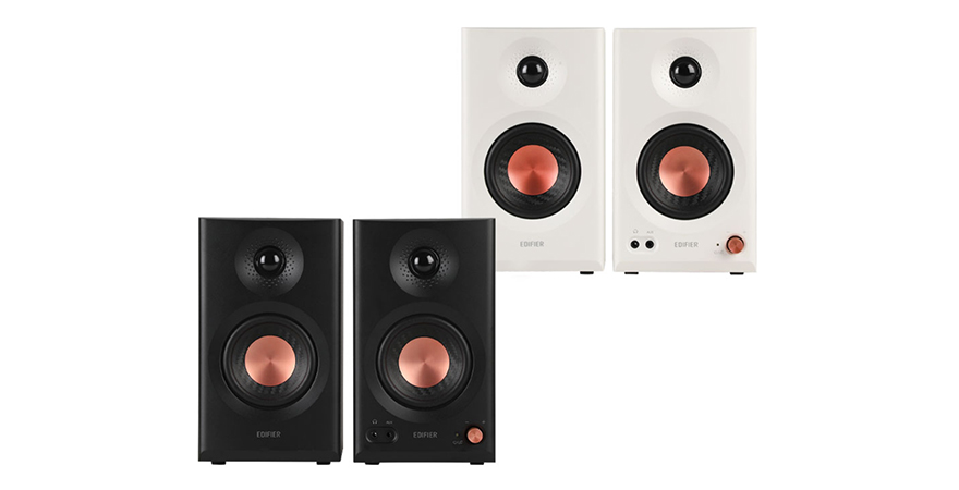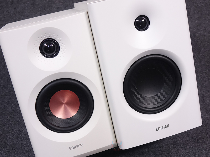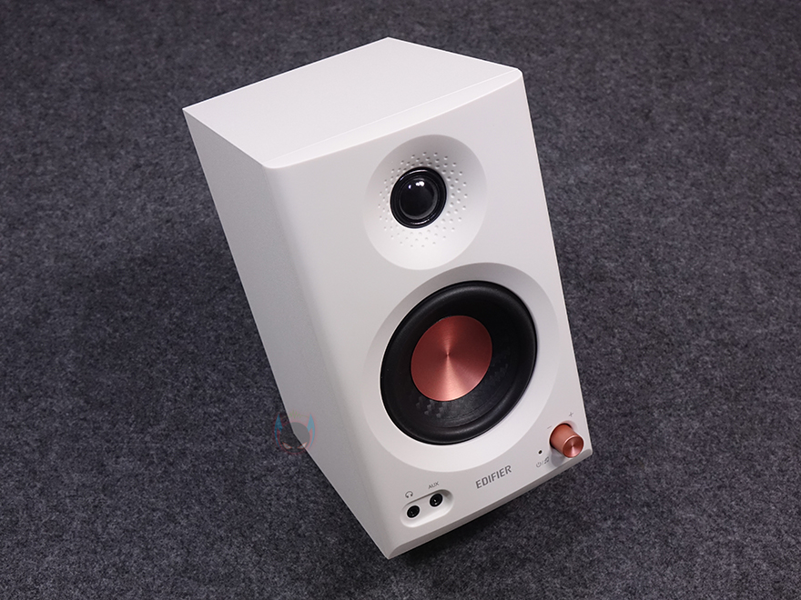 에디파이어(Edifier) MR3 스피커 외형을 살펴보면, 일단 색상은 앞서 잠깐 언급했듯이 MR4와 마찬가지로 블랙과 화이트 2가지 색상으로 출시했습니다. 화이트 색상 같은 경우에는 완전 화이트색상보다는 아이보리 컬러가 좀 느껴지는 화이트입니다. 전체적인 외형은 MR4와 유사하지만, 크기는 좀 더 컴팩트해졌죠. MR4는 140x228mm 크기였는데, MR3는 높이와 깊이 모두 조금씩 줄어든 125.5x220mm 크기를 가졌습니다. 둘을 비교하면 쉽게 구분이 될 정도입니다. 그리고, 전면에는 MR4와 마찬가지로 MR3에서도 위에는 고음 담당의 1인치 크기의 실크-돔 트위터(silk dome tweeters)가 적용되었으며, 아래에는 MR4보다 0.5mm 줄어든 3.5인치 미드-로우 드라이버(mid-low drivers) 유닛이 적용되어 중저음을 담당합니다. 미드 유닛이 줄어들었기 때문에 전체 사운드 출력도 스피커당 3W 줄어든 18+18W의 총 36W를 출력합니다. 대신에 주파수 범위는 좀 더 넓어졌고, 소리크기도 92.5dB로 높아졌습니다. 또한, 미드 유닛 중앙에는 로즈골드 색상계열로 포인트 디자인을 적용하고 있는데, 소비자에 따라선 호불호가 있을 수 있겠습니다.