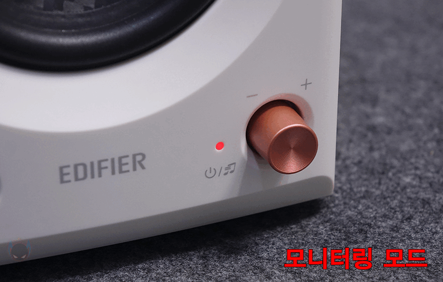 그리고, 오른쪽 스피커 전면에 배치된 볼륨 조절 및 모드 전환 노브(Knob)를 버튼처럼 누르면 모드 전환이 되는데, 모드에 따라서 왼쪽에 있는 LED 인디케이터 색상이 바뀝니다. 모니터링(Monitoring) 모드일 때는 레드(Red), 음악(Music) 모드일때는 그린(Green), 커스터마이즈(Customize) 모드일때는 화이트(White) 색상이죠.