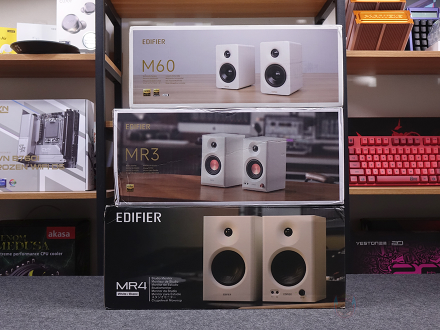 제품 박스부터 살펴보면, 패키지 형태는 MR시리즈와 유사합니다. 무엇보다 MR4와 MR3 제품박스보다 더 작죠. 뒤에서 다시 확인하겠지만, 스피커 크기에서 확연한 차이를 보입니다. 박스 전후면에는 MR4와 MR3 제품처럼 색상이 다른 2가지 색상으로 제품 이미지를 각각 담고 있으며, 모델명 아래에 콘셉트 문구를 멀티미디어 스피커라고 표기하고 있죠. 실제로 M60은 엄연히 말해 MR4, MR3와 다른 콘셉트로 나왔습니다. MR4와 MR3는 스튜디오 스피커 콘셉트로 나온 반면, M60은 데스크탑 스피커 콘셉트로 나왔습니다. 실제 에디파이어 홈페이지에서 이렇게 구분되고 있습니다. 그래서, MR4나 MR3에는 자체 테스트한 주파수 음역 결과를 박스에 담고 있는데, M60 같은 경우에는 박스에 이런 내용이 없죠.