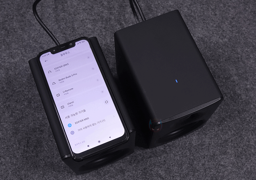 터치 버튼에는 가운데 전원 버튼을 기준으로 양쪽으로 각각 볼륨조절 터치 버튼이 배치되어 있으며, 전원이 켜진 상태에서 전원 버튼을 한 번씩 터치하면 연결모드를 전환할 수 있는데, AUX 연결모드일때는 그린(Green), USB 연결모드일 때는 레드(Red), 블루투스 연결모드일 때는 블루(Blue) LED로 표시해 주죠. AUX와 USB는 각각 제공되는 케이블을 PC 등의 연결할 외부 기기에 연결하면 바로 사용할 수 있으며, 블루투스 연결은 다른 블루투스 연결 모드를 선택하면 자동으로 페어링 모드가 작동되는데, 이때 연결할 기기에서 블루투스 검색을 통해, 'EDIFIER M60'이 검색되면 선택해서 연결 마무리 해주면 됩니다.