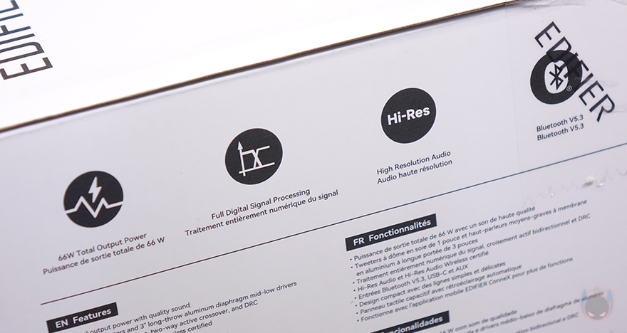 그리고, 박스 한쪽 측면에는 제품 사이즈를 표기해놨는데, 이미 MR4 스피커 좀 안다면, 크기가 작다란 걸 쉽게 짐작할 수 있습니다. 또한, 반대쪽 측면에는 제품의 주요 특징을 표기해 놨는데, 총 66W 사운드 출력, 풀-DSP, Hi-Res 오디오 지원, 블루투스 5.3 지원, USB와 AUX 연결방식, 터치 컨트롤, 크기, 앱 지원을 확인할 수 있습니다. 그리고, 아래에는 다국적 언어로도 특징을 표기하고 있으며, 그 아래에는 간략하세 기본 사양도 표기해 놨죠. 아쉽게 한국어는 포함되어 있지 않습니다.