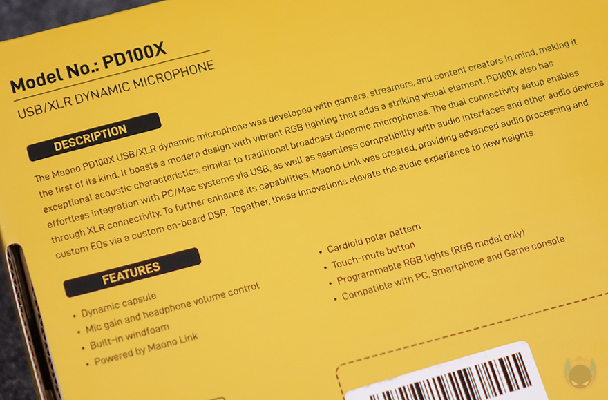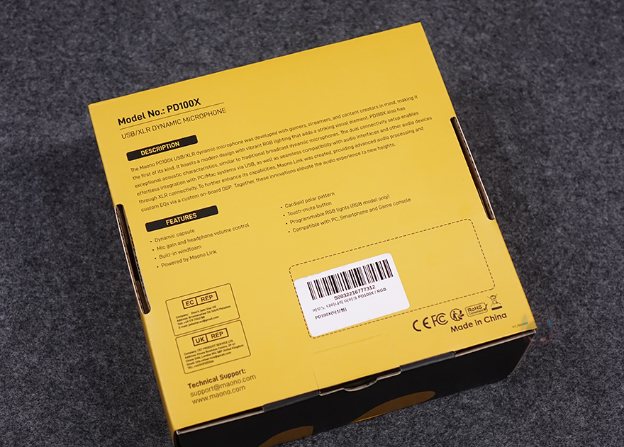 제품 박스부터 살펴보면, 박스 전면에는 모델명과 함께 USB/XLR 다이나믹(Dynamic) 마이크를 명시와 함께 제품 이미지를 확인할 수 있는데, 제품 이미지만 봐도 이 제품이 어떤 콘셉트로 나왔다라는 걸 짐작할 수 있고, 아래에도 RGB 라이트닝 효과를 표기해 놨습니다. 그리고, 마오노 공용 소프트웨어인 Maono Link 지원표기도 확인할 수 있죠. 박스 한쪽 측면에는 주요 특징을 표기해 놨는데, 스탠드 기본포함, USB-C/XLR 연결 지원, 2-in-1 디지털 노브, RGB 지원, 터치방식 음소거 버튼을 확인할 수 있습니다. 박스 후면에는 다른 마오노 제품들처럼 PD100X 소개문구와 함께 추가 특징 표기를 더 확인할 수 있죠.