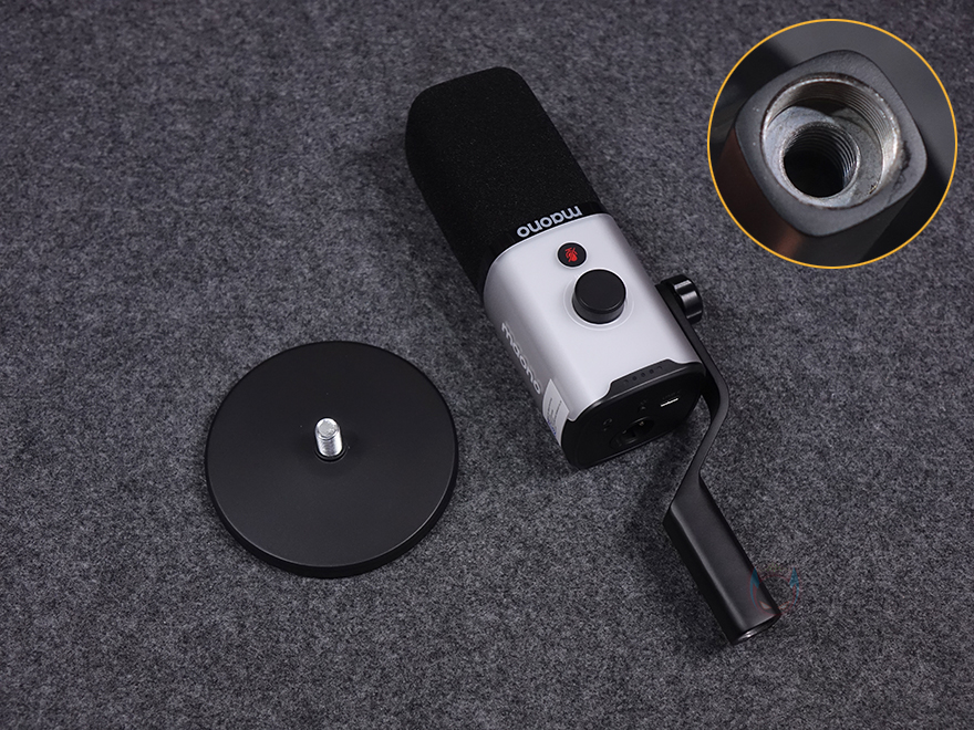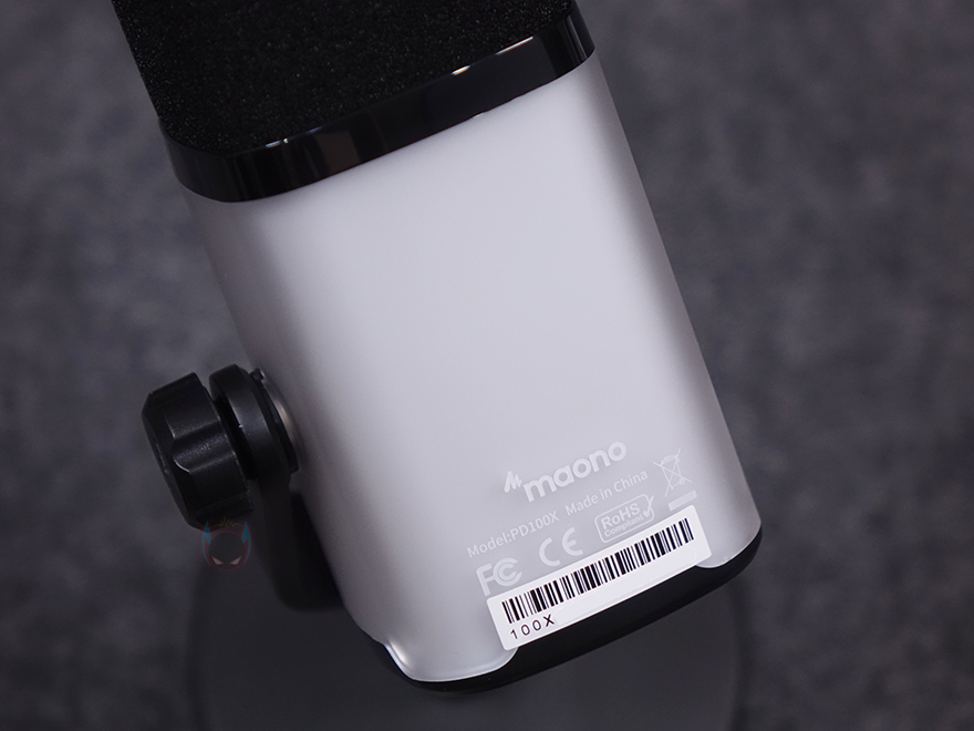 리뷰에서는 RGB 버전으로 살펴보는데, 뒤에서 확인하겠지만, 마이크 아랫부분 전체 360도로 RGB 라이트닝 효과를 볼 수 있습니다. 그리고, 아랫부분에 전면에는 게인(Gain) 조절과 헤드폰(Headphone) 볼륨조절을 할 수 있는 2-in-1 노브(Knob)가 적용되어 있으며, 바로 위에는 터치(Touch) 방식의 음소거 버튼이 배치되어 있죠. 한쪽 측면에는 MAONO 로고를 새겨놨으며, 뒷면은 특별한 게 없고, 나머지 반대쪽 측면에는 마이크 각도조절 레버가 적용되어 있죠.