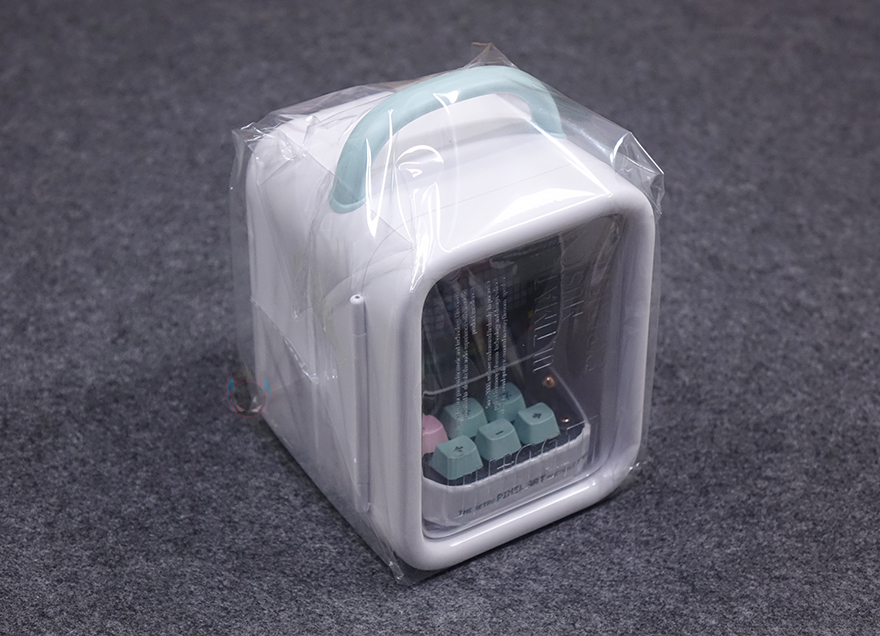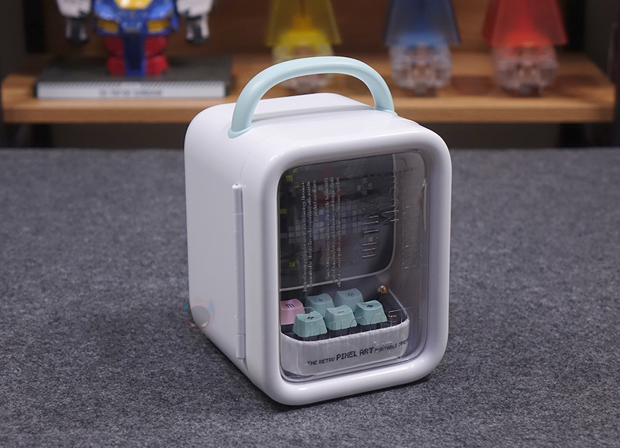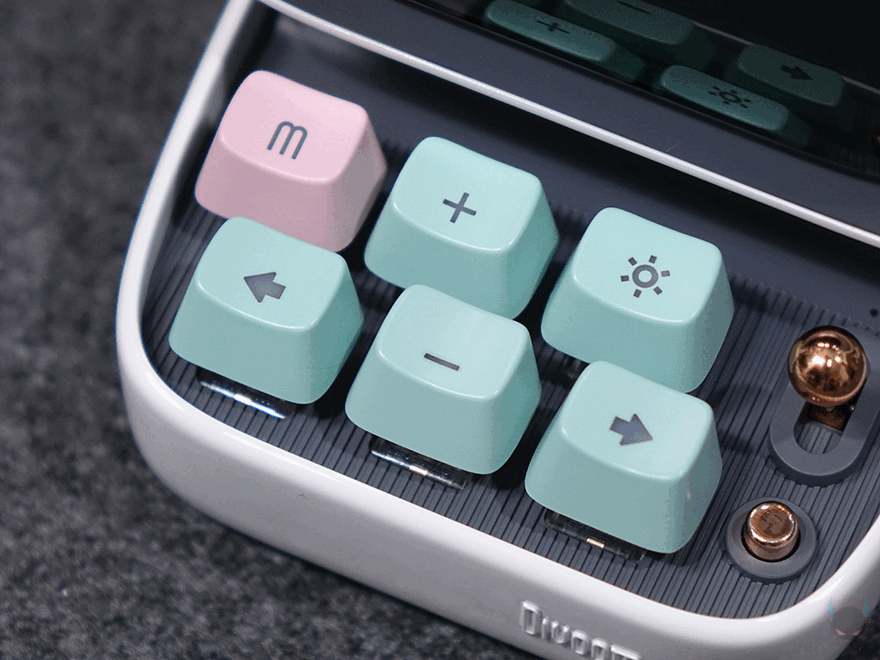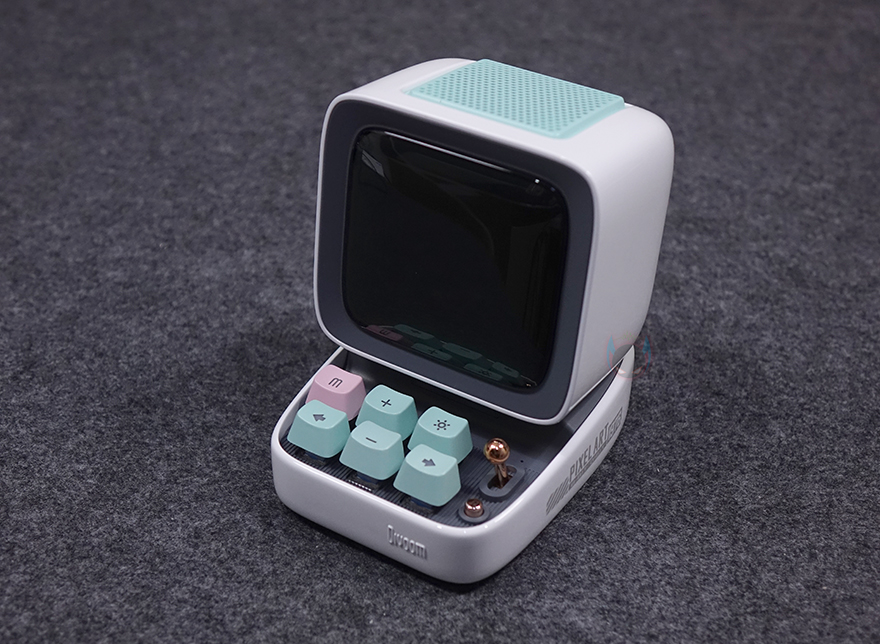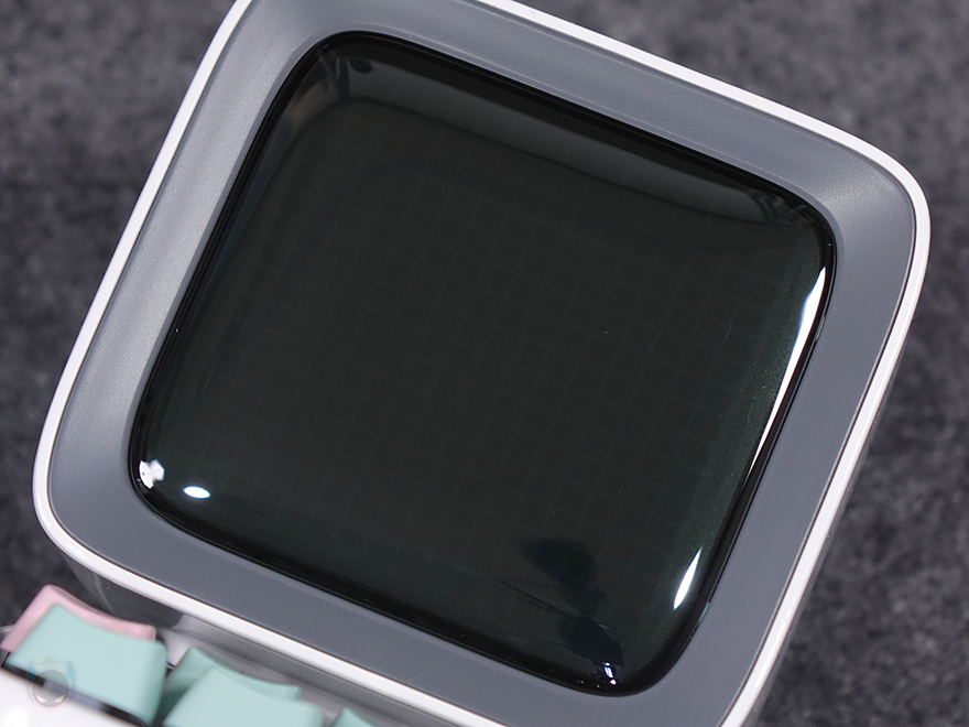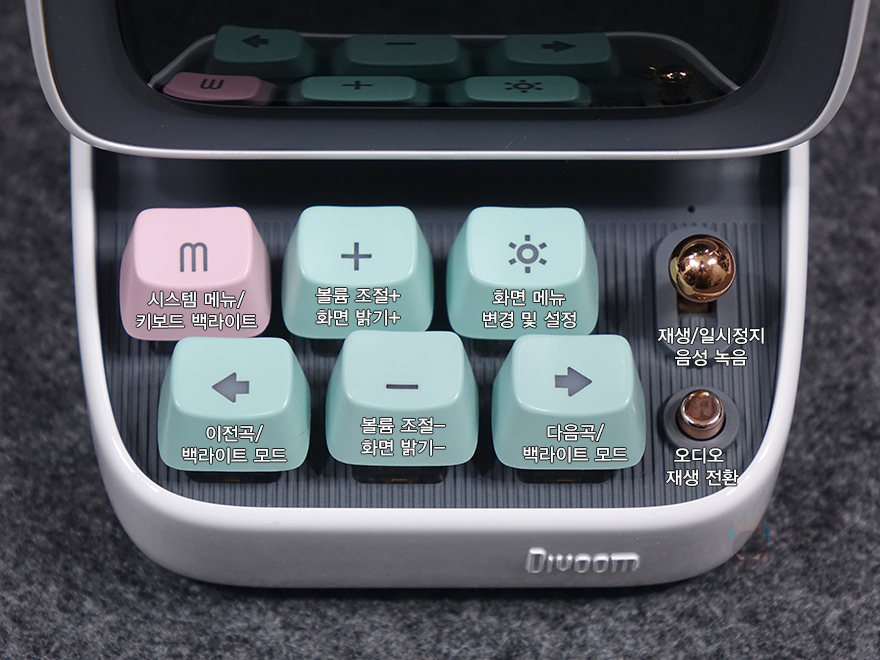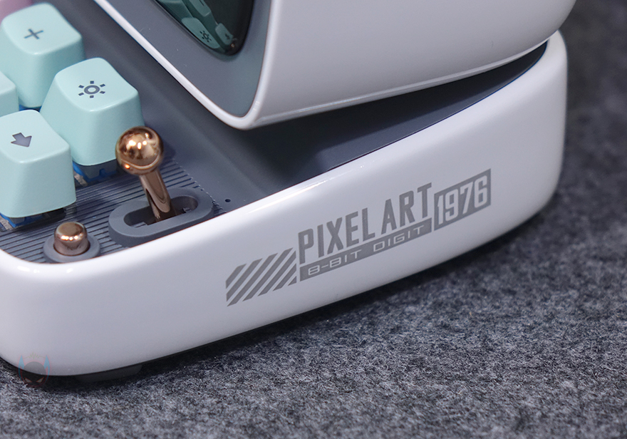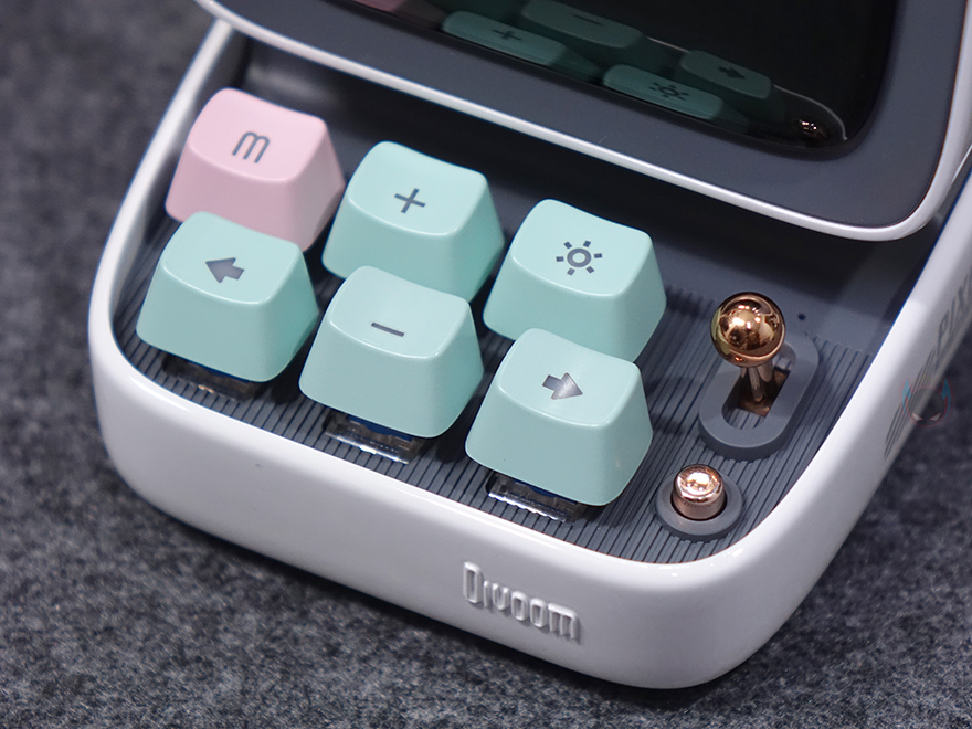 화면 아래는 컴퓨터의 키보드 부분을 모티브로 실제 6개의 키보드 자판과 오른쪽에 레버와 버튼이 배치되어 있습니다. 참고로, 기본 모델인 Ditoo에는 레버만 존재합니다. 키 자판은 키캡과 실제 기계식 키보드에 사용되는 스위치 조합으로 키캡을 분리하면 스위치를 확인할 수 있는데, 클릭키(Clicky)인 청축입니다. 그리고, 키캡에는 기능 표시를 해놨는데, 기능 부분은 뒤에서 다시 언급하며, 옆에 레버와 레버 아래 버튼 역시 뒤에서 다시 언급하겠습니다. 키보드 디자인 측면에는 PIXEL ART 1976이라는 문구로 이 제품의 디자인이 레트로 컴퓨터 모티브라는 걸 좀 더 정확히 파악할 수 있습니다.