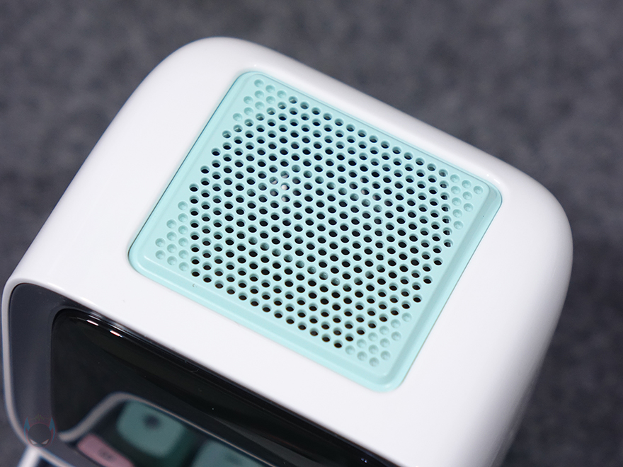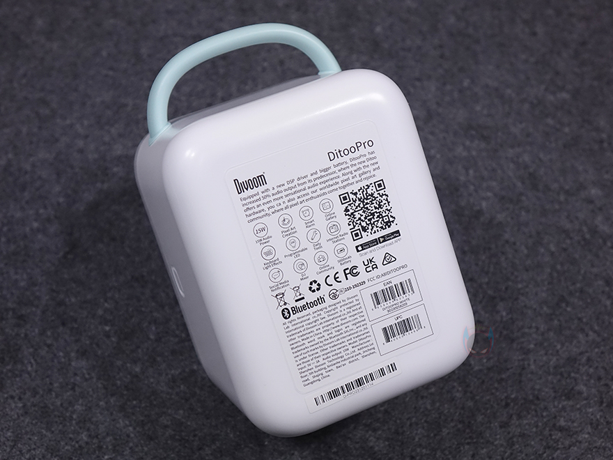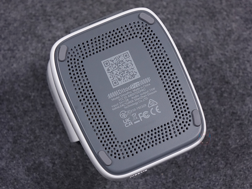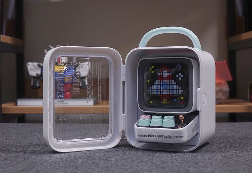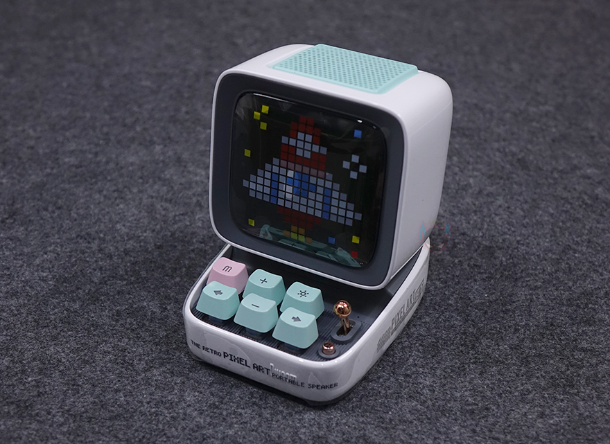좀 더 자세히 살펴보면, 앞서 잠깐 언급했듯이 제품 디자인의 모티브는 컴퓨터입니다. 그래서, 모니터 모양의 디스플레이 부분은 약 3.3인치 크기를 가졌는데, 근접해서 보면 화면 내부에 픽셀(Pixel) 칸을 볼 수 있습니다. 뒤에서 작동시 화면을 보겠지만, 총 픽셀 칸은 16x16으로 256입니다. 그리고, 디스플레이 상단 부분에는 에이홀 디자인과 함께 내부에 스피커가 내장되어 있는데, 유닛 크기는 48mm 풀-레인지로 먼저 나왔던 Ditoo보다 5W 출력이 높아진 총 15W 사운드 출력을 갖추고 있습니다. 후면에는 베이스 포트(Bass Port)도 확인할 수 있죠.