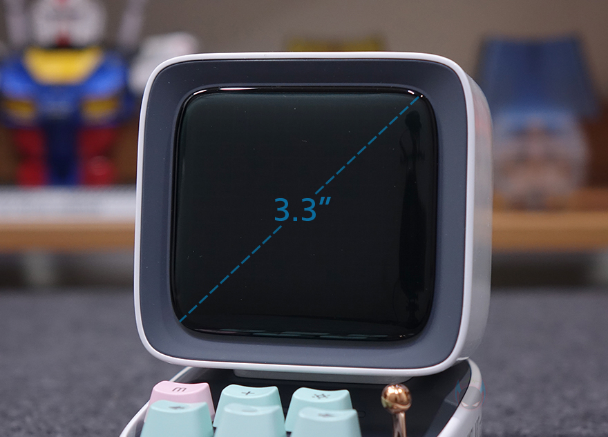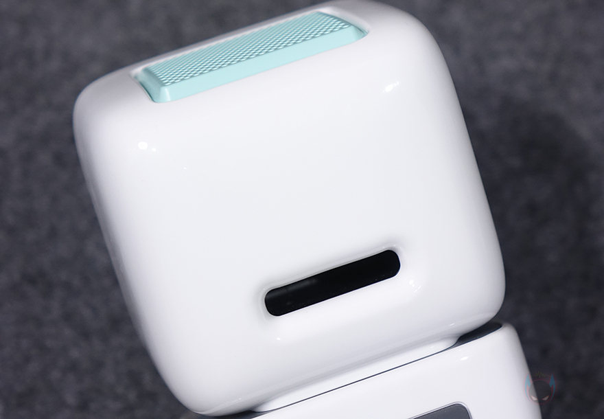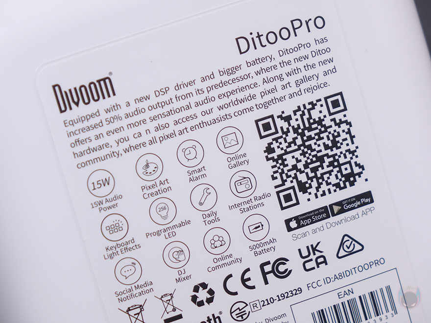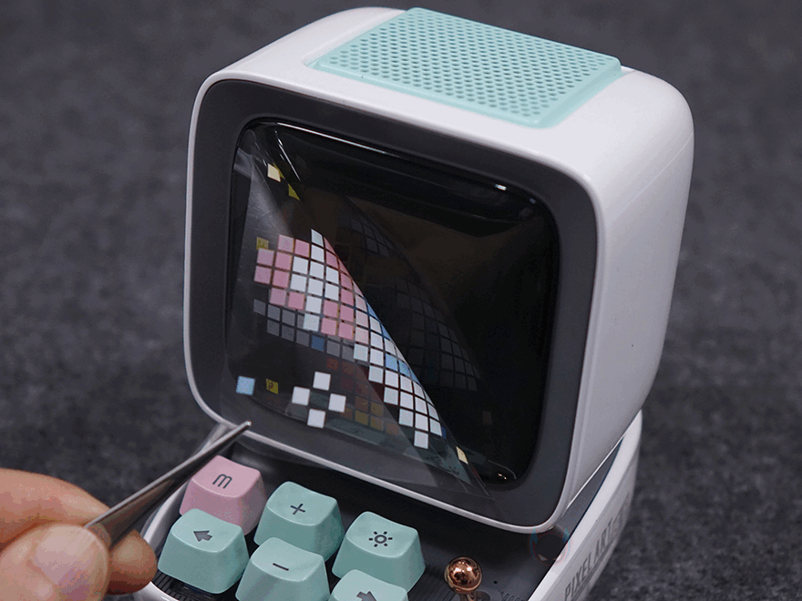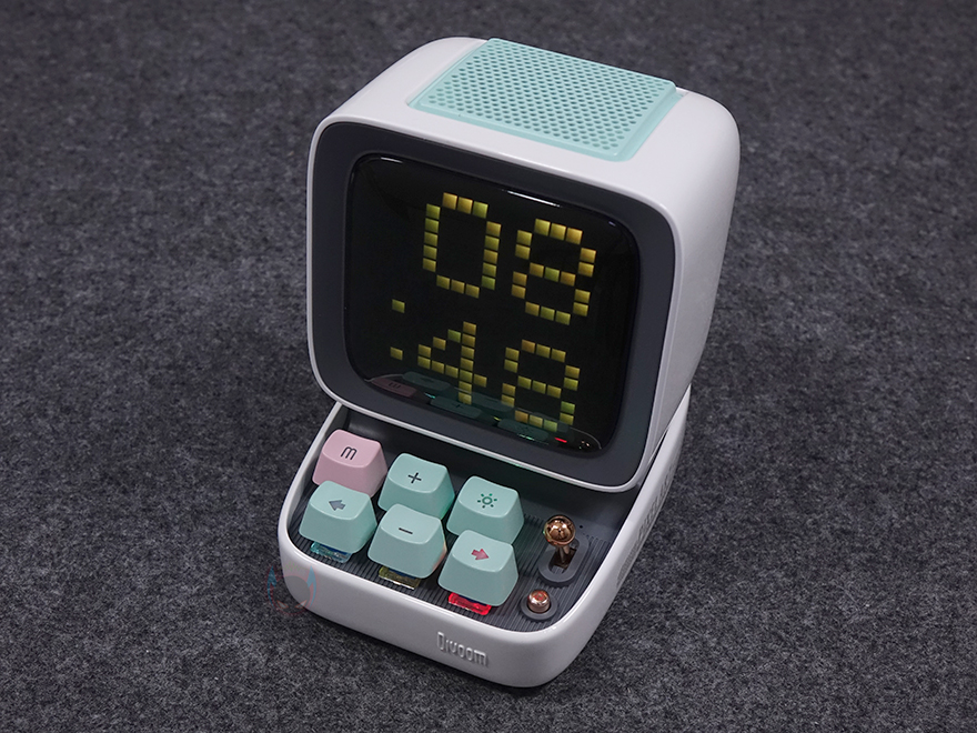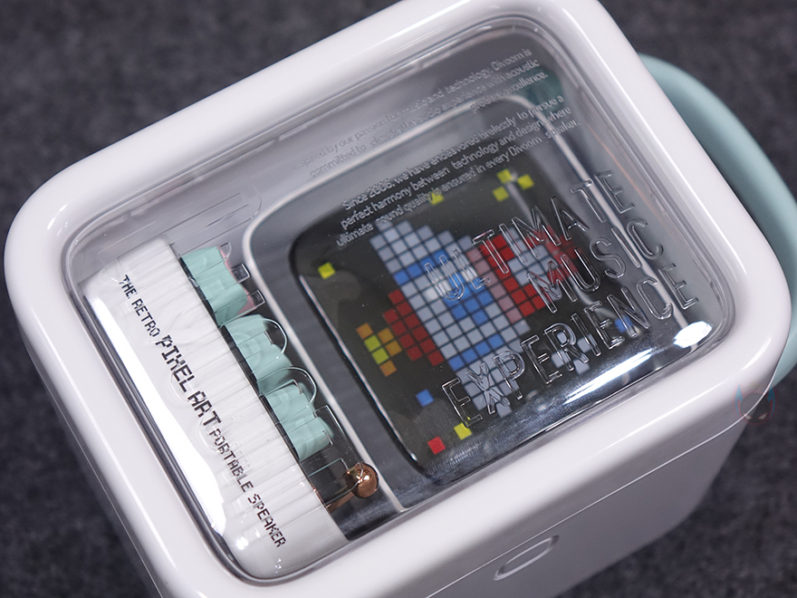 좀 더 자세히 살펴보면, 앞서 잠깐 언급했듯이 제품 디자인의 모티브는 컴퓨터입니다. 그래서, 모니터 모양의 디스플레이 부분은 약 3.3인치 크기를 가졌는데, 근접해서 보면 화면 내부에 픽셀(Pixel) 칸을 볼 수 있습니다. 뒤에서 작동시 화면을 보겠지만, 총 픽셀 칸은 16x16으로 256입니다. 그리고, 디스플레이 상단 부분에는 에이홀 디자인과 함께 내부에 스피커가 내장되어 있는데, 유닛 크기는 48mm 풀-레인지로 먼저 나왔던 Ditoo보다 5W 출력이 높아진 총 15W 사운드 출력을 갖추고 있습니다. 후면에는 베이스 포트(Bass Port)도 확인할 수 있죠.