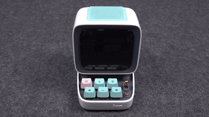 직접, 디붐(Divoom) Ditoo Pro(디투 프로)를 사용해보면, 키보드 후면에 있는 전원 버튼을 1초 이상 누르고 있으면 전원이 켜지는데, 바로 픽셀 디자인의 시작 화면을 볼 수 있으며, 그다음 시간 표시로 전원 켜지는 게 마무리됩니다. 참고로, 시작 화면의 픽셀 디자인은 전원을 켤 때마다 랜덤으로 나옵니다. 전원이 켜진 상태에서 키보드로 다룰 수 있는 기능들을 살펴보면, 일단 m 키 같은 경우에는 짧게 눌렀을 때 시스템 메뉴로 들어가며, 길게 눌렀을 때는 키보드 아래 백라이트 효과를 On/Off 할 수 있습니다. 그리고, 같은 위치 맨 오른쪽에 있는 키는 디스플레이 적용 화면을 변경할 수 있으며, 길게 눌렀을 때는 해당 화면의 기능 설정으로 들어갑니다. 디스플레이에 적용되는 화면 메뉴는 뒤에 앱에서 확인할 수 있으며, 가운데 배치된 +와 -키는 짥게 눌렀을 때 볼륨 조절(Volume control), 길게 눌렀을 때 화면밝기조절(Screen brightness control) 기능이 됩니다. 그리고, 좌우(←→) 방향키는 짧게 눌렀을 때 음악재생의 이전/다음 기능이며, 길게 눌렀을 때는 키보드 백라이트 모드 전환입니다. 그리고, 오른쪽에 배치된 레버 같은 경우 음악 재생 시에는 재생/일시정지 기능이고, 길게 레버를 당기고 있으면 음성 녹음 기능이 실행됩니다. 또한, 레버 아래 있는 버튼은 오디오 재생 장치 전환으로 블루투스 재생 외에 앞서 후면에서 본 TF카드 슬롯에 음원파일을 담고 있으면 전환해서 재생할 수 있는 거죠.
