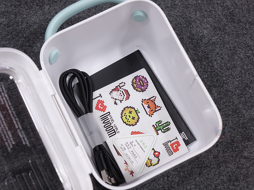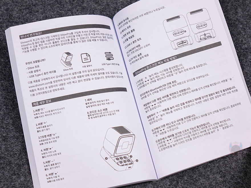 보관용 케이스에서 Ditoo Pro를 꺼내면, 케이스 안쪽에 포장재를 확인할 수 있는데, 포장재에 나머지 구성품이 있다는 표시 문구를 확인할 수 있습니다. 그래서, 포장재까지 꺼내면, 나머지 구성품들을 확인할 수 있고, 전체 제품 구성에는 Ditoo Pro 픽셀 아트 스피커, USB 전원 및 충전케이블, 제품 설명서, 스피커 제공으로 이루어져 있죠. 참고로, 제품 설명서에는 한국어도 포함되어 있으며, 개봉시에는 Ditoo Pro에 디스플레이 부분과 측면, 그리고 아래 하단부까지 곳곳에 보호비닐이 부착되어 있습니다.
