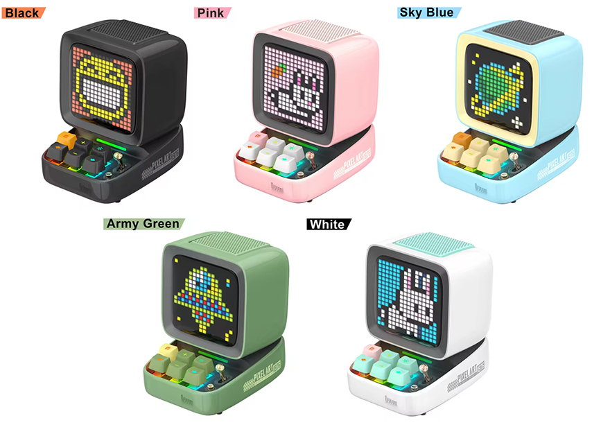 시작에서도 잠깐 언급했지만, 디붐(Divoom)의 Ditoo Pro(디투 프로)는 디붐이라는 브랜드를 소비자들에게 가장 잘 알린 제품입니다. Ditoo Pro 이후로도 픽셀 아트 콘셉트의 다양한 제품들이 나오고 있지만, 그래도 데스크 인테리어 아이템으로 가장 많이 선택하는 모델은 현저리 Ditoo Pro죠. 일단, 레트로 컴퓨터를 모티브로 한 컴팩트한 사이즈의 디자인과 자신만의 스타일로 꾸며서 화면에 담을 수 있는 픽셀 디자인 설정, 그리고 키보드 자판 특성을 그대로 담아 기능과 백라이트를 적용한 부분은 데스크에 올려놓으면 눈길을 끌 수 밖에 없는 제품입니다. 여기에 편집기 전용 앱을 통해 사용자만의 다양한 픽셀 디자인을 적용할 수 있고, 사용자들끼리 만든 작품을 앱 상에서 공유해 적용할 수 있는 부분은 스타일을 추구하는데 부족함이 없는 지원이죠. 또한, 5가지 컬러 색상으로 나와서 구매시 소비자 선택폭도 넓습니다. 일상에서 자주 볼 수 있는 사물을 컴팩트한 사이즈 디자인으로 적용해 스피커와 픽셀이라는 조합으로 나만의 스타일로 꾸며 데스크에 올려놓고 싶었다면, 디붐 Ditoo Pro를 추천합니다.