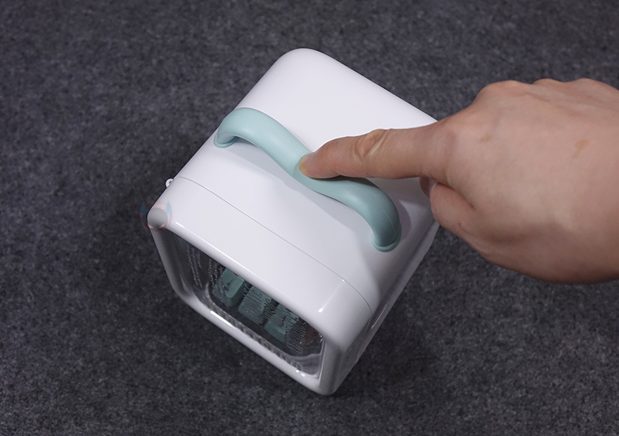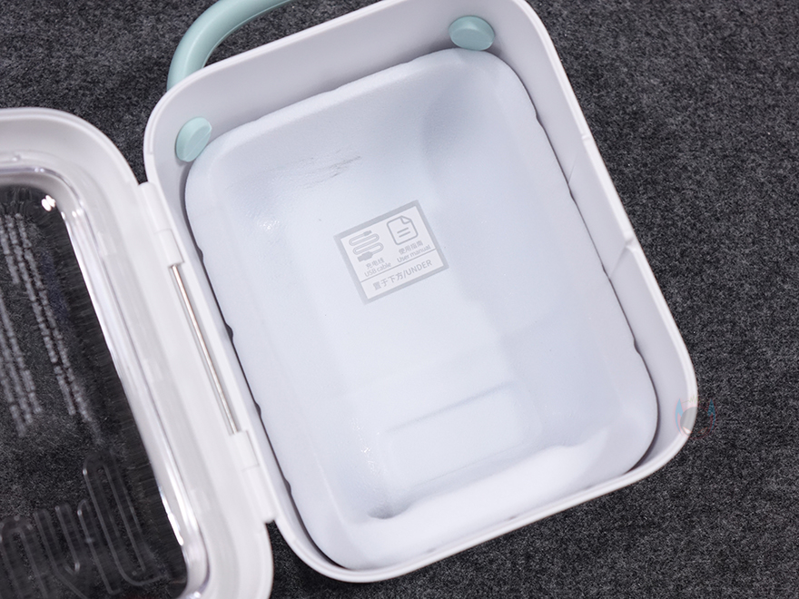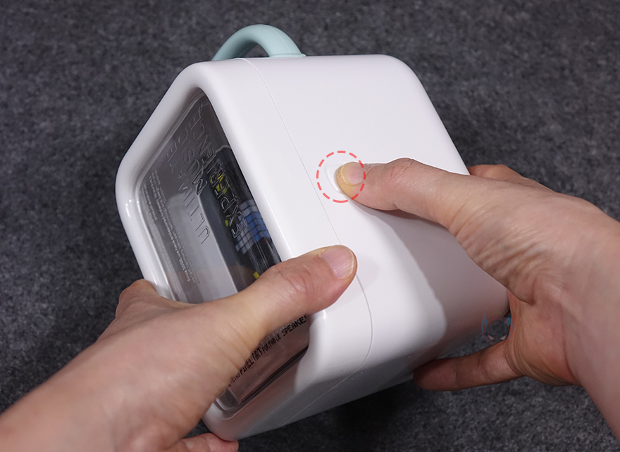 패키지 종이백에서 꺼내면 비닐포장된 Ditoo Pro를 확인할 수 있으며, 비닐포장을 제거하면, Ditoo Pro 보관용 케이스를 먼저 볼 수 있는데, 보관용 케이스도 이동시 편의를 위해 손잡이를 적용하고 있으며, 고무 재질처럼 탄력성을 가지고 있습니다. 케이스 전면에는 투명처리로 콘셉트 문구 등을 새겨놨으며, 케이스 후면에 종이백에서 확인했던 6가지 특징 외에 추가 특징 표기를 더 확인할 수 있으며, 앱 다운로드 QR코드도 다시 확인할 수 있죠. 케이스를 열때는 오른쪽 측면에 표시된 ㅁ자 부분을 눌러서 도어처럼 열면 됩니다.