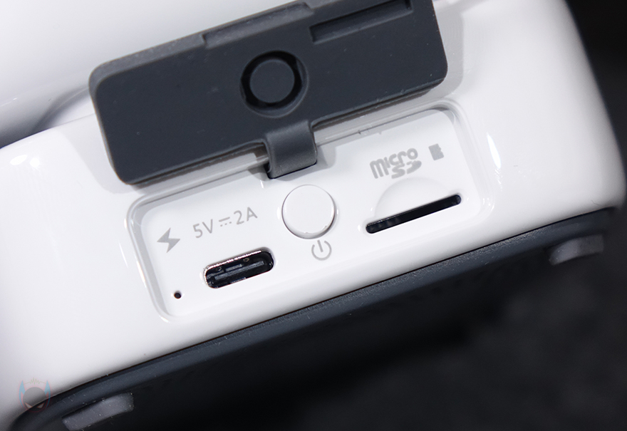 그리고, 후면에는 전원 버튼 및 포트와 슬롯이 있는데, 커버가 적용되어 있어서 사용하지 않을 시 먼지 유입 방지 및 부식 방지를 할 수 있습니다. 커버를 열면, 가운데 전원 버튼이 베치되어 있고, 왼쪽에는 제공되는 USB 전원 및 충전케이블과 연결되는 USB 타입 C포트가, 오른쪽에는 TF카드슬롯이 배치되어 있습니다. 참고로 커버 중앙에 표시된 On/Off는 커버를 닫은 상태에서도 On/Off부분을 누르면 전원을 켤 수 있다는 걸 의미합니다. 그리고, TF카드 슬롯은 최대 64GB 용량까지 지원하며, TF카드에 음원파일(MP3, WAV, FLAC)을 넣고 재생할 수 있습니다. 끝으로, 밑바닥에는 에어홀 디자인과 함께 모서리 부근으로 패드 받침대가 부착된 걸 확인할 수 있죠.