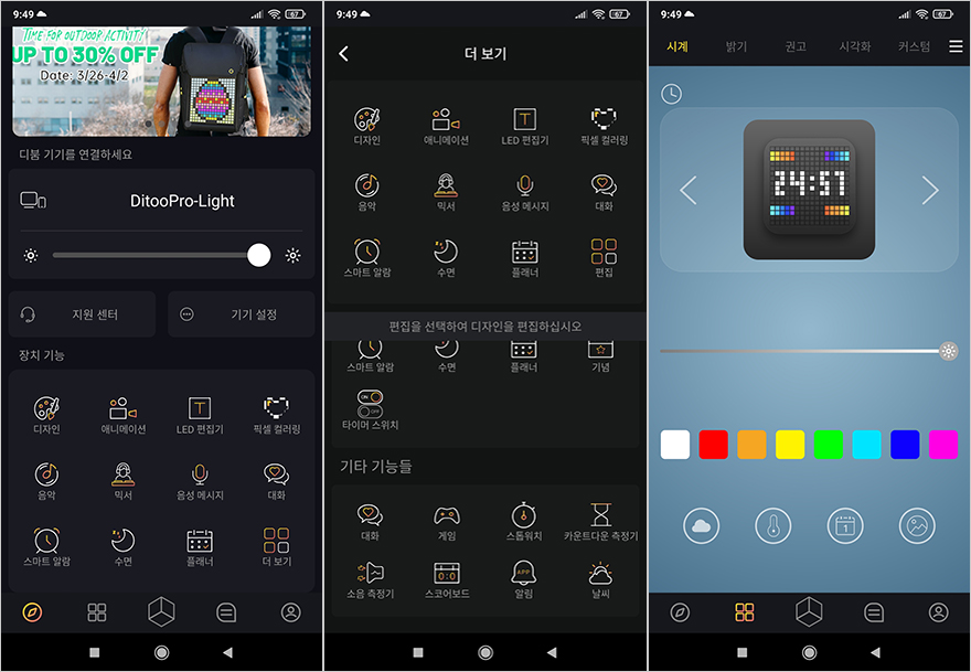 끝으로, Ditoo Pro의 픽셀 아트 기능을 더 다양하게 설정 및 적용할 수 있게 Divoom 편집기 앱(App)도 지원을 하는데, 블루투스 연결이 되어 있으면 앱에서 바로 장치 인식이 되며, 만약 되어있지 않을 시 앱을 실행하면 자동으로 연결 진행이나 기기 추가로 연결하면 됩니다. 앱에서 장치가 인식되면, 앞서 확인한 시스템 메뉴를 사용자가 원하는 메뉴로 설정할 수 있으며, 화면에 나오는 기능 역시 시계부터 대기까지 6가지 기능의 대한 상세 설정을 사용자가 적용할 수 있습니다. 이밖에 편집기 앱에서는 다른 유저가 만든 픽셀 디자인을 공유하고 있어서 원하는 픽셀 디자인을 바로 적용할 수도 있으며, 커뮤니티 공간과 자신의 계정정보도 확인할 수 있습니다.