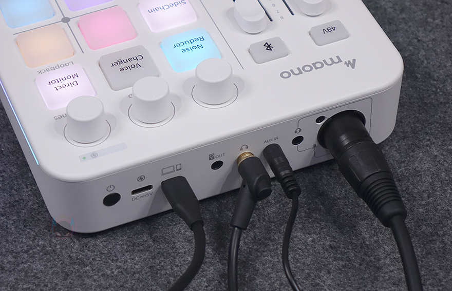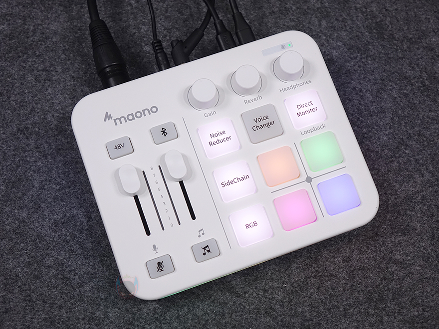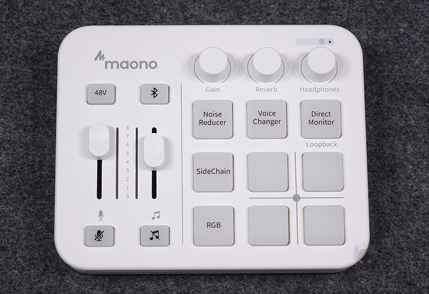 G1 Neo 상단에는 조작부로 혼자서 사용하기 딱 필요한 기능들만 담고 있으며, 버튼과 노브에 모두 기능 표기를 해놔서 쉽게 이해할 수 있습니다. 왼쪽 MAONO 로고가 있는 부분에는 48V 팬텀 파워 On/Off 스위치, 바로 옆에는 블루투스(Bluetooth) 스위치, 그 아래에는 각각 마이크 볼륨 조절과 오디오 볼륨 조절 페이더가 있으며, 각 페이더 아래에는 각각 마이크 음소거(Mute) 스위치와 오디오 음소거 스위치가 배치되어 있습니다. 그리고, 상판 오른쪽으로는 맨 위에 3개의 노브(Knobs)가 있는데, 게인(Gain), 리벌브(Reverb), 헤드폰(Headphones)이라고 표기되어 있어 쉽게 기능을 알 수 있으며, 그 아래로는 사운드 패드들(Sound pads)로 고유 기능이 있는 패드들은 기능을 명시해 놨습니다. 고유 기능 패드에는 노이즈 감소(Noise Reducer), 음성변조(Voice Changer), 다이렉트 모니터(Direct Monitor), 사이드 체인(SideChain), RGB 기능이며, 나머지 표기되지 않은 4개의 패드는 사용자가 녹음해 지정해서 사용할 수 있는 패드입니다.