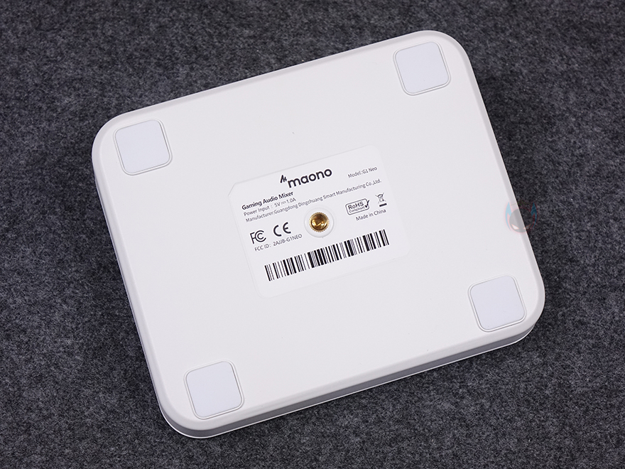 본격적으로 마오노(Maono) G1 Neo 오디오 인터페이스(Audio Interface)를 살펴보면, 일단 색상은 화이트와 블랙 2가지 색상으로 출시되었는데, 블랙색상은 오디오 인터페이스에서 흔히 볼 수 있는 색상이고, 화이트 색상이 의외로 깔끔하고 예쁩니다. 무광처리가 잘 되어 있어서 차분한 화이트 느낌을 줍니다. 크기는 159x131x5mm로 한눈에 봐도 컴팩트한 느낌을 주는데, 스마트폰과 비교해도 크다라는 느낌이 들지 않죠. 무게도 약 360g으로 무겁지 않습니다. 측면에서 보면 자사의 다른 오디오 인페이스 제품들과 마찬가지로 G1 Neo도 사용하기 편하도록 기본 경사도를 가지고 있으며, 양쪽 측면과 아래쪽으로 RGB 라이트닝 효과를 볼 수 있게 라인 처리가 되어있는 것을 확인할 수 있죠.