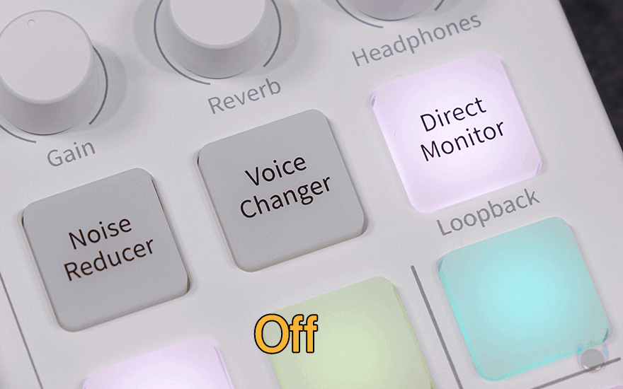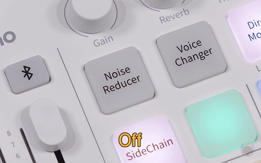 끝으로, 기능별로 작동을 살펴보면, 일단 마이크 볼륨과 배경음 오디오 볼륨을 조절할 수 있는 왼쪽에 배치된 페이더를 움직였을 때만 라이트닝 효과를 보여줍니다. 당연히 제일 낮게 내렸을 때는 보이지 않죠. 그리고, 아래에 배치된 마이크와 오디오 볼륨 음소거(Mute) 버튼들 역시 음소거가 활성화되었을 때만 레드(Red) 색상으로 켜집니다. 주변 소음을 감소시켜주는 Noise Reducer 패드 같은 경우에는 기능 Off일 때는 라이트가 없고, Noise Reducer-Low 모드일 때는 화이트(White), Noise Reducer-High 모드일때는 블루(Blue) 색상으로 켜져 구분할 수 있습니다. 바로 오른쪽에 있는 음성 변조(Voice Changer) 기능 패드 역시 Off 일때는 라이트가 켜지지 않고, 여성(Female) 모드일때는 옐로우(Yellow), 남성(Male) 모드일때는 블루(Blue), 아기(Baby) 모드일때는 그린(Green), 로봇(Robot) 모드일때는 퍼플(Purple) 색으로 켜집니다. 나머지, 사이드 체인이나 RGB, 다이렉트 모니터 패드를 On/Off에 따라 화이트 색상이 켜지고 꺼짐입니다.