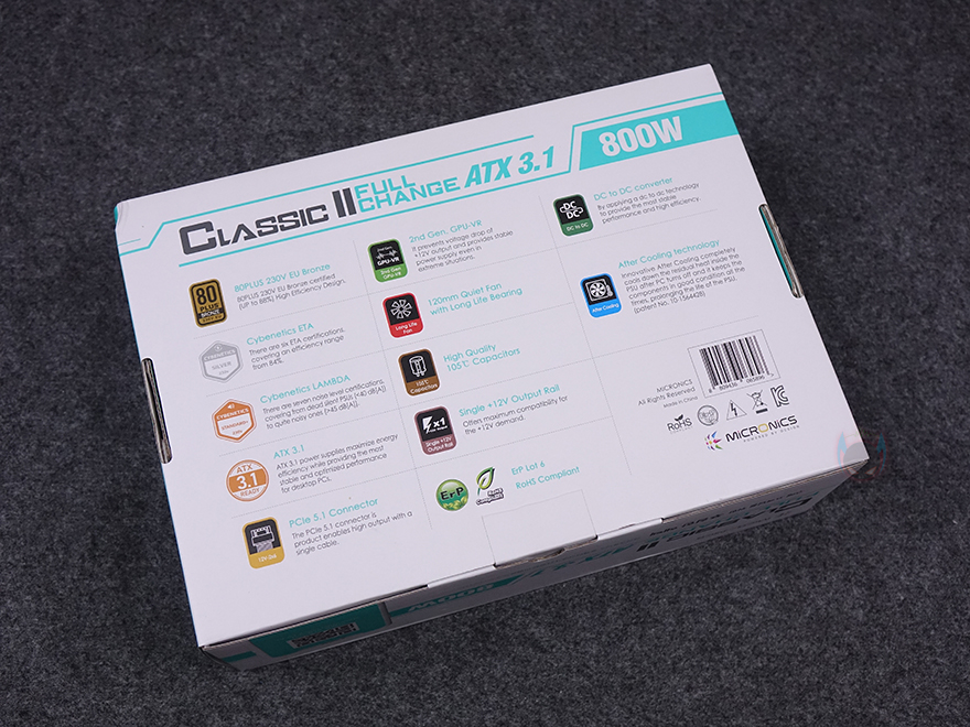 그럼, 마이크로닉스 클래식 2 풀-체인지 화이트 파워서플라이 외형부터 살펴보면, 한눈에 봐도 화이트 콘셉트를 쉽게 알 수 있죠. 본체부터 케이블까지 모두 화이트 색상으로 적용하고 있습니다. 본체 같은경우 상단에는 특정 패턴 디자인의 에어홀 처리와 함께 내부에 120mm 팬이 장착된 것을 확인할 수 있는데, 팬 역시 화이트 색상임을 미리 확인할 수 있습니다. 그리고, 후면 역시 내부 발열 배출을 위해 특정 패턴의 에어홀 디자인을 적용하고 있죠. 또한, 측면에는 라인업 문구를 새겨놨으며, 밑바닥에는 다시 한번 제품의 기본 사양표기를 확인할 수 있습니다.