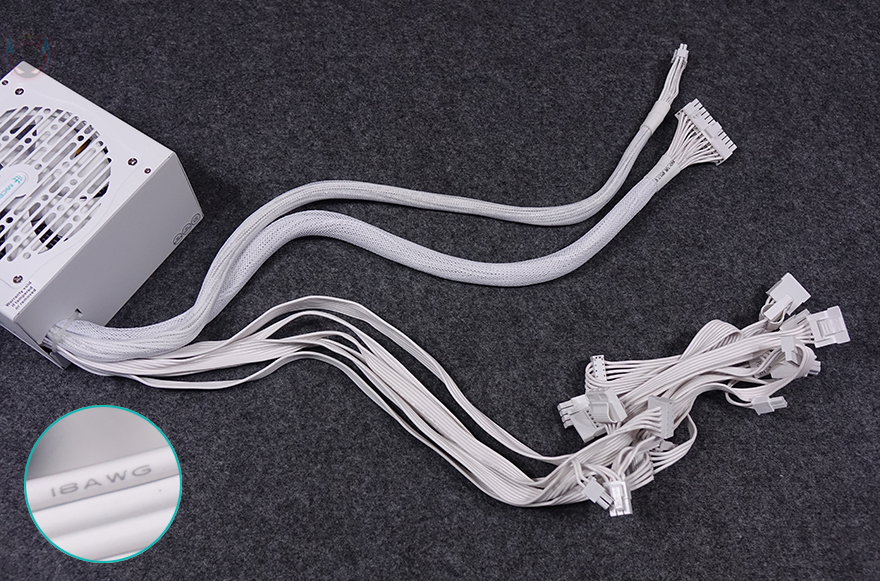 이번엔 본체에 연결된 케이블들을 살펴보는데, 케이블 같은경우 메인보드 24핀 커넥터와 PCIe 5.1 지원으로 새롭게 나오기 시작한 12V-2x6 커넥터 케이블은 일반 케이블형태에 슬리빙처리를 했으며, 나머지 케이블들은 모두 플랫(Flat) 타입니다. 참고로, 12V-2x6 커넥터 케이블에 사용된 전선 규격은 16 AWG이며, 플랫 타입 등의 나머지 케이블은 18 AWG로 인텔 파워서플라이 가이드 규격에 맞춰 적용했습니다. 그리고, 커넥터 지원 같은 경우 리뷰에 사용된 800W 용량모델은 방금 언급한 메인보드 24핀과 12V-2x6 커넥터 외에 ATX 8(4+4) 핀 2개, PCIe 8(6+2) 핀 2개, SATA 커넥터 8개, PATA 커넥터 4개를 지원하며, SATA 커넥터 같은 경우 8개 중 4개와 PATA 커넥터는 분리를 쉽게 할 수 있는 이지스왑 디자인으로 적용했습니다. 케이블 길이들은 요즘 PC케이스 맞춰서 충분한 여유 길이를 가지고 있습니다.