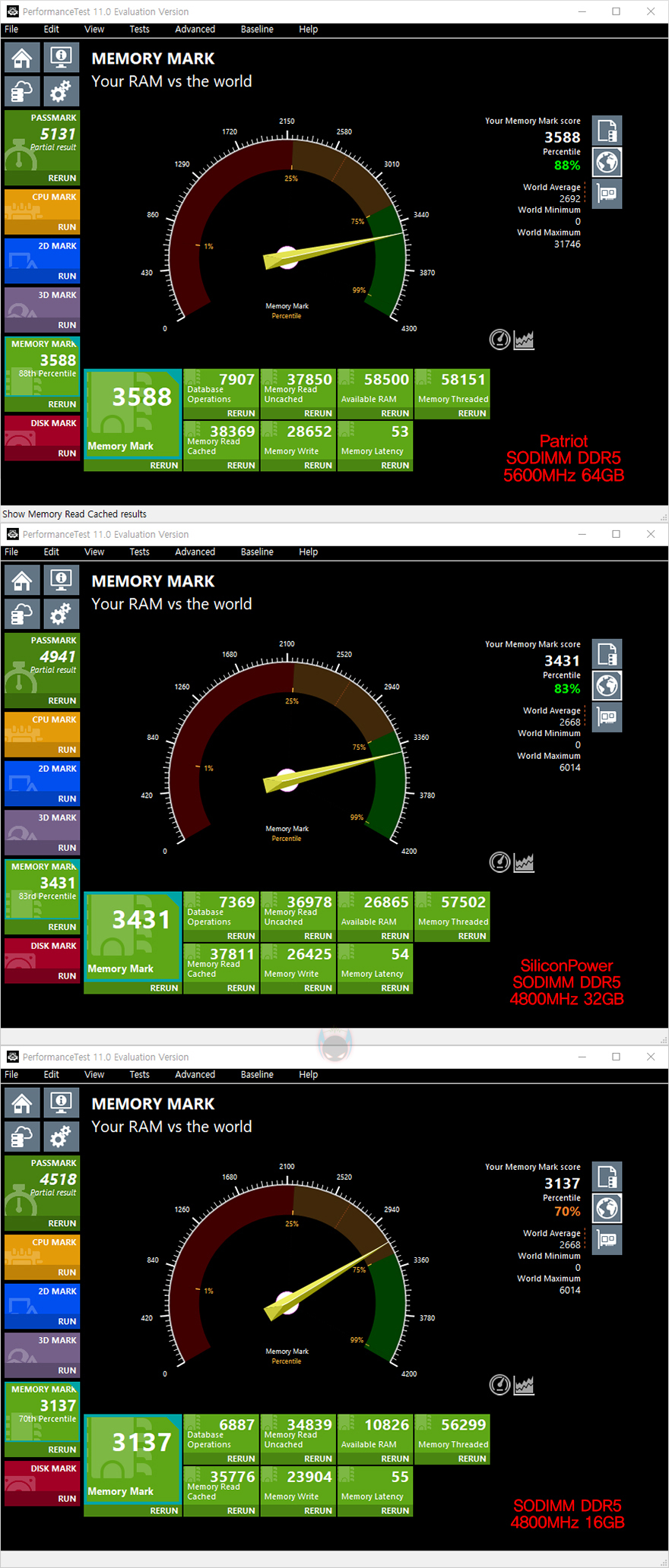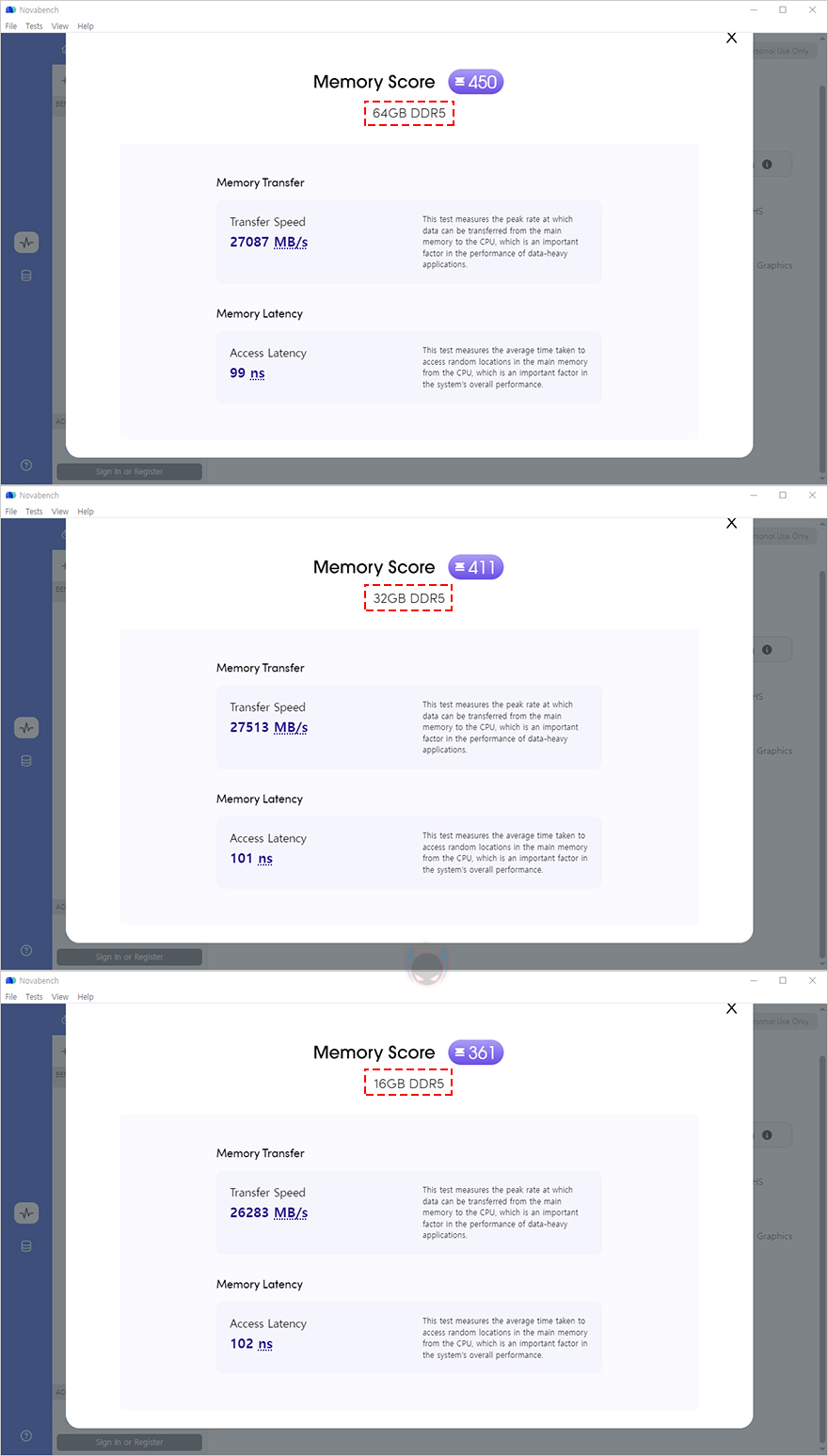 방금 언급했듯이, 패트리어트 SIGNATURE LINE 노트북용 DDR5-5600 32GB 메모리는 현재 SODIMM DDR5 메모리에선 최상급에 속합니다. 처음 SODIMM DDR5 메모리는 4800MHz으로 작동했죠. 그래서, 4800 MHz 클럭의 16GB 듀얼채널(32GB)과 8GB 듀얼채널(16GB) 메모리와 비교를 해보면, 일단 가장 흔히 메모리 벤치마크로 사용하는 AIDA64의 Cache&Memory Benchmark 테스트로 확인해 보면, 읽기 차이는 크지 않지만, 쓰기와 복사 대역폭이 용량 차이가 있는 만큼 확실한 차이를 보여주며, 클럭 역시 좀 더 높기 때문에 레이턴시도 좀 더 빠른 결과값을 보여줍니다. 이 밖에 추가 메모리위주의 벤치마크 프로그램들 VOVSOFT의 RAM Benchmark, MaxxMEM, Novabench의 Memory Test, Passmark PerformanceTest의 Memory Mark 모두에서도 패트리어트(PATRIOT) SIGNATURE LINE 노트북용 DDR5-5600 32GB 메모리 듀얼채널(64GB) 구성이 가장 좋은 결과값을 보여줬습니다.