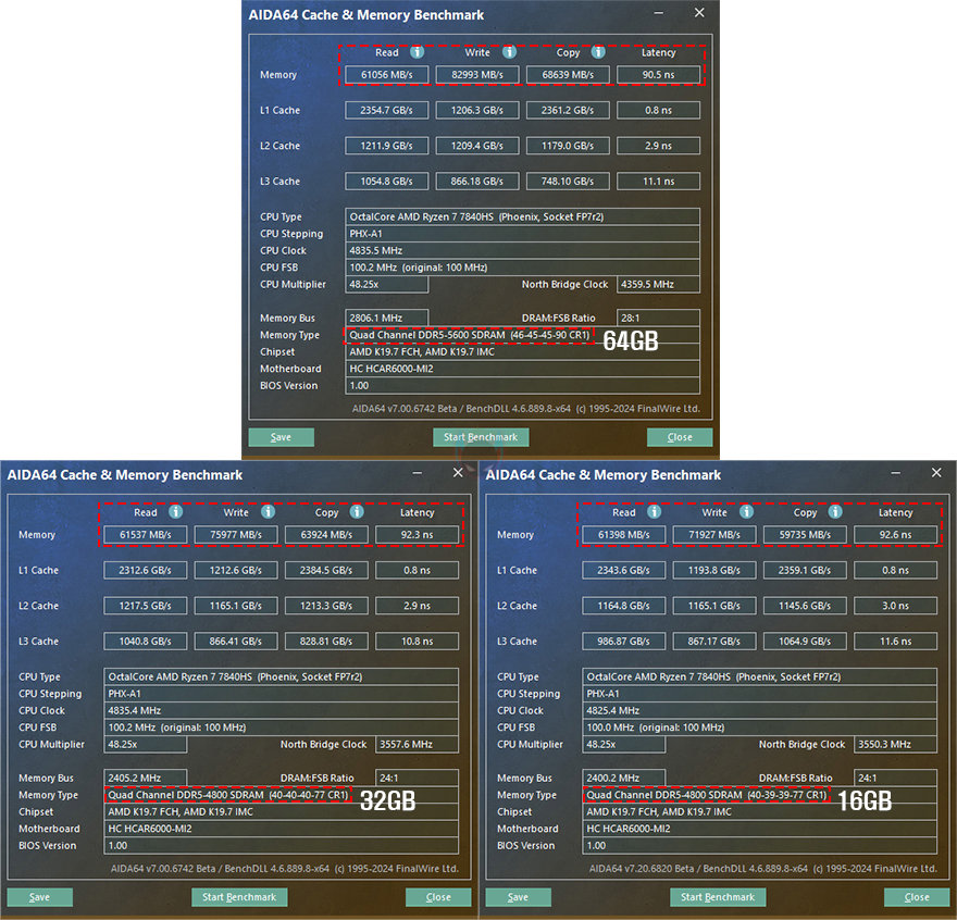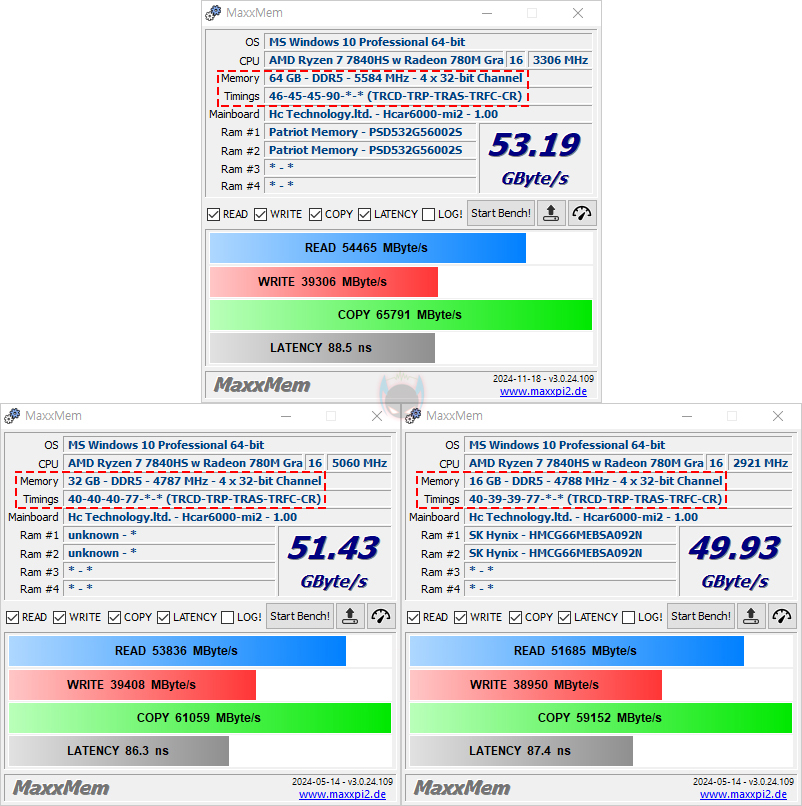 이제, 패트리어트(PATRIOT) SIGNATURE LINE 노트북용 DDR5-5600 32GB 메모리의 성능을 확인해보는데, AMD 라이젠 7 7840HS CPU와 라데온 780M 내장그래픽기반의 미니 PC에 듀얼채널로 메모리를 장착하면, CPU-Z를 통해 64GB 용량과 5600 MHz 작동클럭을 확인할 수 있습니다. 노트북/미니 PC에선 메모리 슬롯이 2개이기 때문에 사실상 SODIMM DDR5 용량으로는 최대 용량이며, 클럭 역시 현재 출시된 SODIMM DDR5로는 가장 높은 클럭입니다.