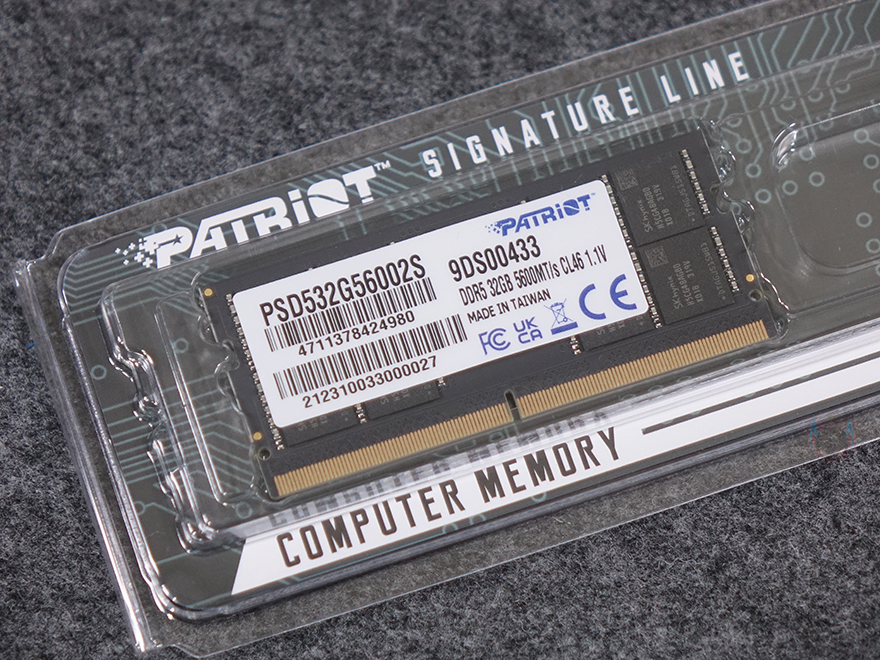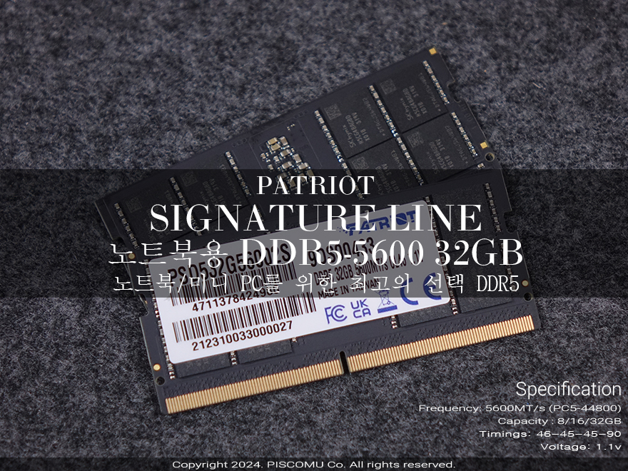 PC 환경을 구상하는 요소들 중 크면 클수록 좋다는 평가를 하는 요소들이 있죠. 예를 들면, 모니터 같은 경우에는 거거익선이라는 말을 사용할 정도로 화면이 클수록 좋고, 저장장치인 SSD 같은 경우에도 용량이 클수록 좋습니다. 그리고, 또 한 가지가 있는데, 바로 메모리(RAM)죠. 특히, 노트북이나 미니 PC에선 데스크탑 PC처럼 오버클럭 지원이 제한적이기 때문에, 메모리 용량이 클수록 좋은데, 이제 노트북/미니 PC도 DDR5 메모리가 자리 잡았습니다. 국내 소비자들에게 공식 수입사 (주)파인인포(https://smartstore.naver.com/pineinfomall)를 통해 데스크탑용 DDR5 메모리에서 큰 인기를 얻고 있는 패트리어트(PATRIOT)는 데스크탑 DDR5 메모리뿐만 아니라 노트북/미니 PC에서 사용할 수 있는 SODIMM DDR5 메모리도 이미 갖추고 있습니다. 그래서, 이번 시간에는 패트리어트의 SODIMM DDR5 메모리에서 가장 용량이 큰 단일 32GB의 'SIGNATURE LINE 노트북용 DDR5-5600 32GB'를 한 번 살펴보도록 하겠습니다.