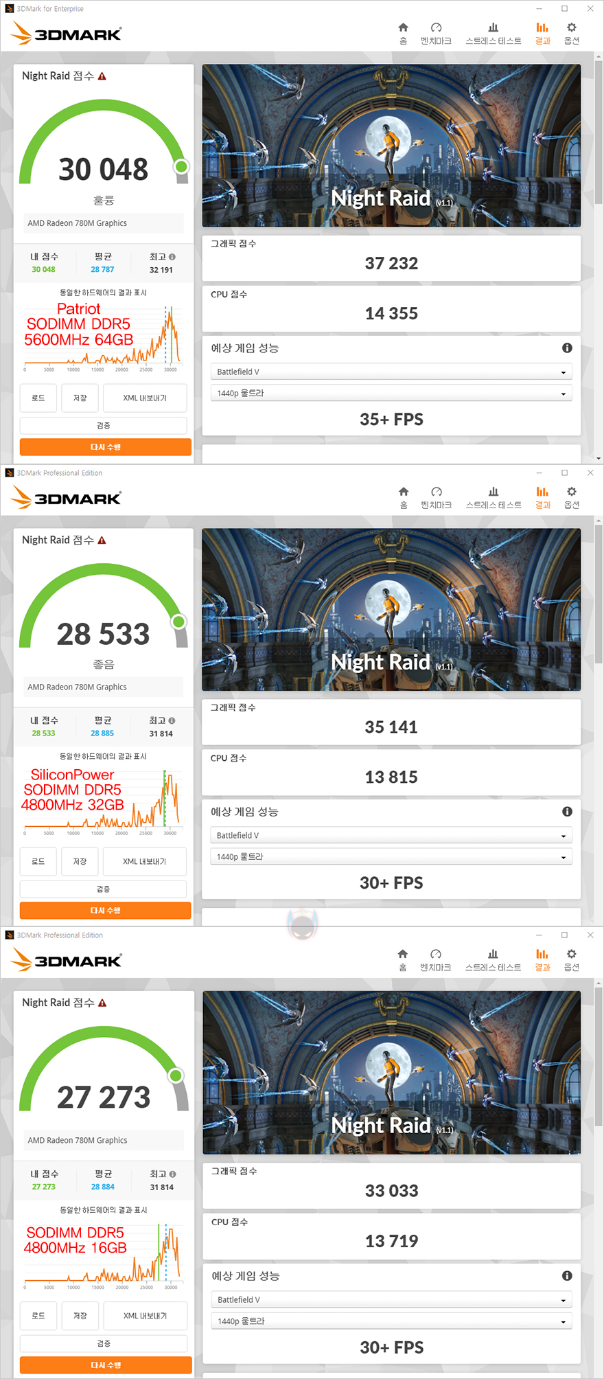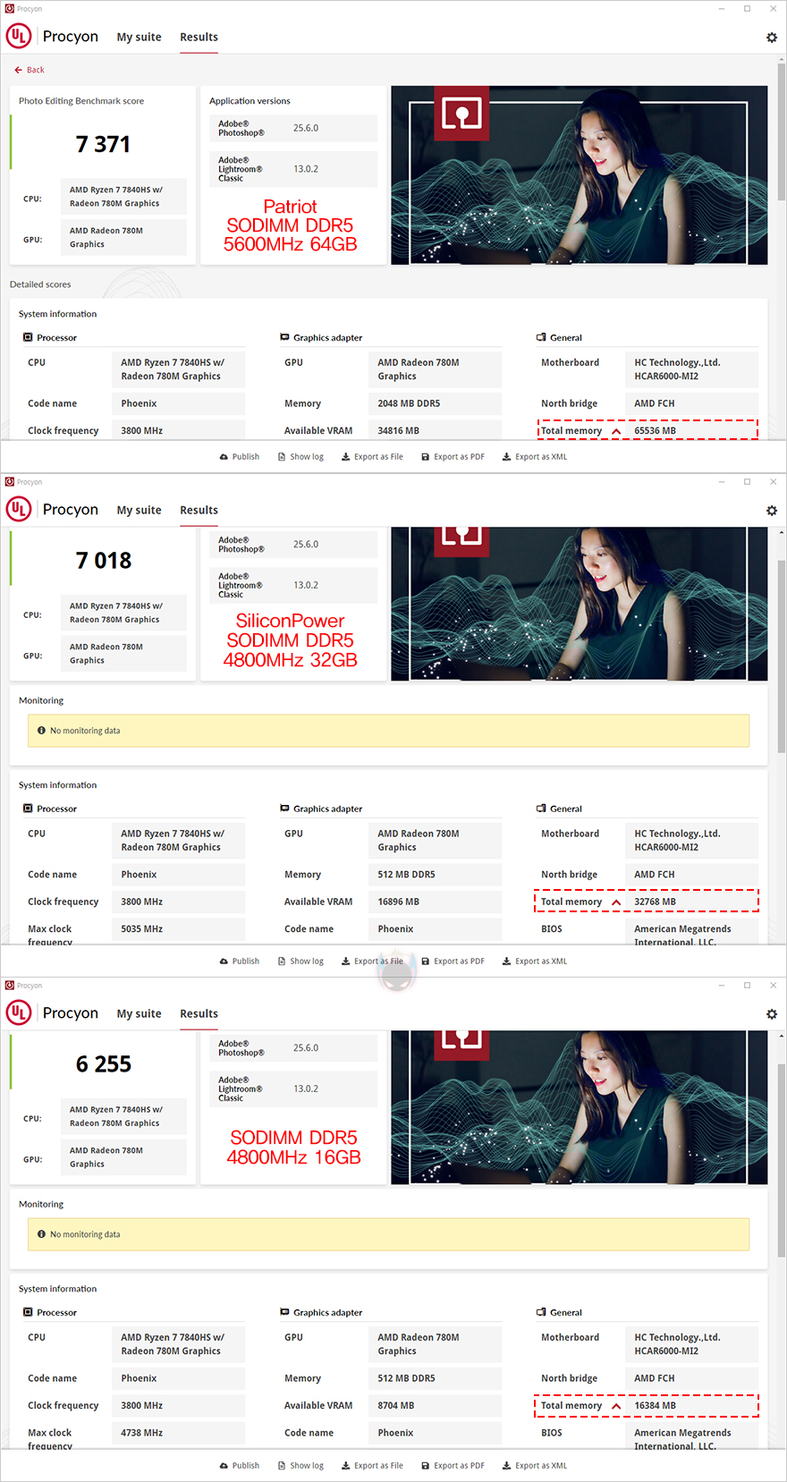 그리고, 게임에서도 메모리는 영향을 주기 때문에, 3DMark 내장그래픽 벤치마크 Night Raid 항목으로 테스트한 결과에서도 역시 패트리어트(PATRIOT) SIGNATURE LINE 노트북용 DDR5-5600 32GB 메모리 듀얼채널 구성의 영향이 가장 높은 점수로 나오는걸 확인할 수 있으며, 마지막으로 편집 작업에서는 메모리 용량이 크면 클수록 좋다라는건 이미 잘 알려진대로 포토샵과 라이트룸 작업으로 벤치마크할 수 있는 Procyon Photo Editing Benchmark에서도 SIGNATURE LINE 노트북용 DDR5-5600 32GB 메모리 듀얼채널 구성이 가장 높은 점수의 결과를 보여줬습니다.