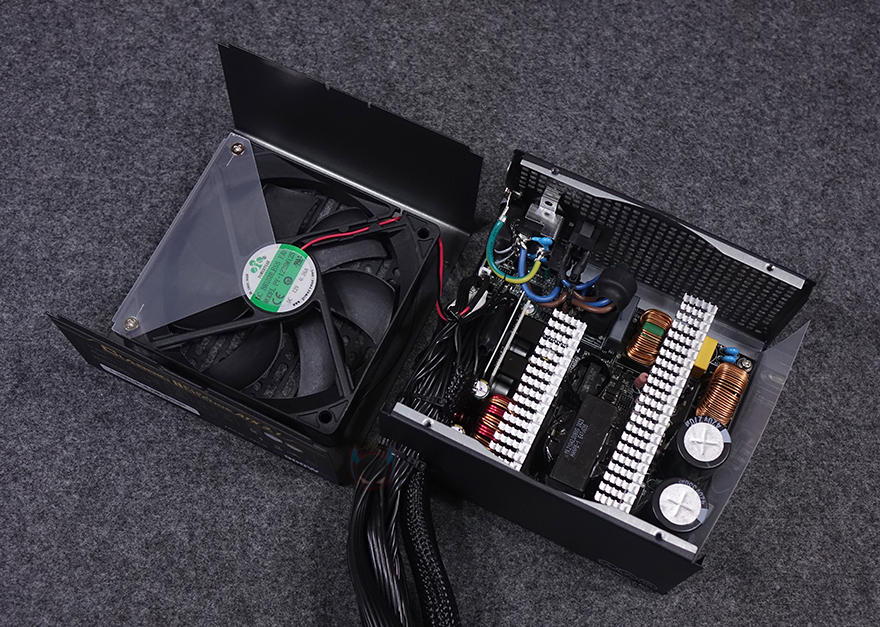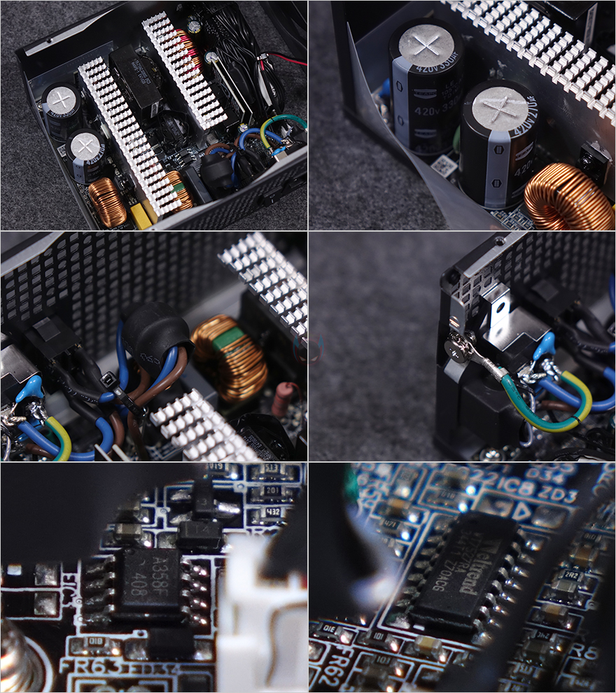 클래식 2 풀체인지 900W 파워서플라이의 내부를 잠깐 살펴보면, 내부에 장착된 120mm 팬은 화이트 모델에도 적용되었던 동일한 팬이며, 저소음 팬인 동시에 일정 온도(50℃)에 도달해야 작동하는 제로팬 기술과 전원을 끈 상태에서도 발열해결을 위해 작동하는 애프터쿨링 기술이 적용되어 있습니다. 공기 흐름 유지를 위해 에어가이드도 기본 장착되어 있죠. 육안으로 확인할 수 있는 내부 구조에는 900W 용량인만큰 내부 발열해결을 위해 좀 더 큰 알루미늄 방열판을 적용하고 있으며, 그 사이도 안정적인 전력공급을 위한 스위칭트랜스가 자리 잡고 있으며, 메인 캐패시터 역시 용량을 고려해 420V/330㎌용량과 420V/270㎌용량 2개를 사용했으며, 화이트 모델과 마찬가지로 대만 TEAPO사 제품을 사용했습니다. 이밖에도 고주파음 최소화를 위한 EMI 필터, 내부 전류흐름방지를 위한 접지, 팬 자동 속도조절을 위한 컨트롤러, 보호회로 칩을 확인할 수 있죠.