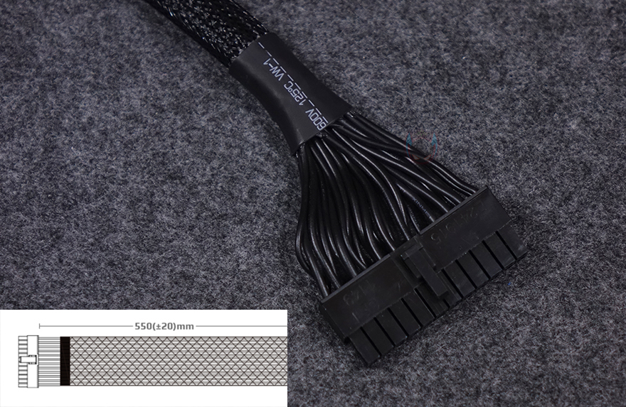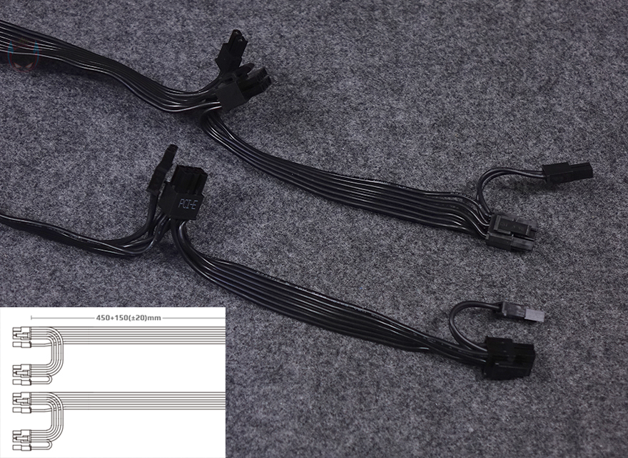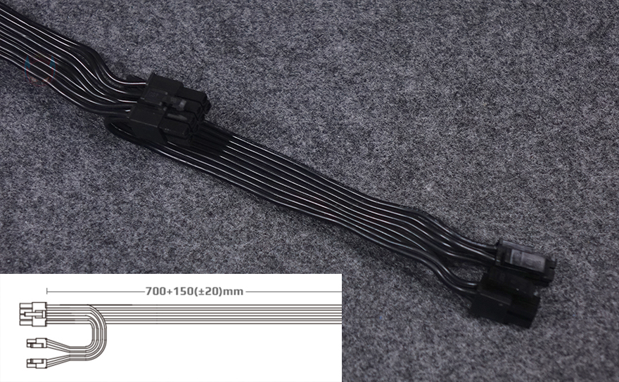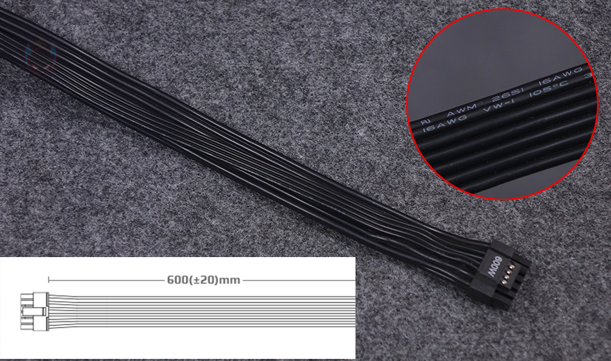 케이블 지원 같은경우에는 메인보드 24핀 케이블만 슬리빙 케이블이고, 나머지 케이블은 관리가 편하도록 플랫(Flat) 타입 케이블을 적용했습니다. 메인보드 24핀을 비롯한 커넥터 지원에는 ATX 보조전원 8핀 1개와 4+4핀 1개, ATX 3.1 규격이 적용되면서 새롭게 바뀐 12V-2x6(12+4핀) 1개, PCIe 8(6+2) 핀 4개, SATA 커넥터 8개, PATA 커넥터 3개 구성으로 제공하고 있습니다. 참고로, 12V-2x6(12+4핀) 케이블의 전선 규격은 16 AWG이며, 나머지 케이블들의 전선규격은 18 AWG입니다. 그리고, 전체 케이블 길이들은 요즘 PC케이스에 맞춰서 여유 있게 가지고 있습니다.