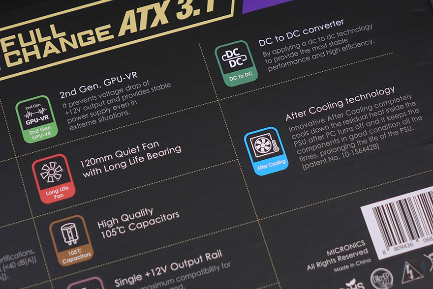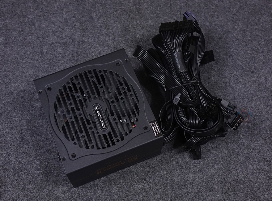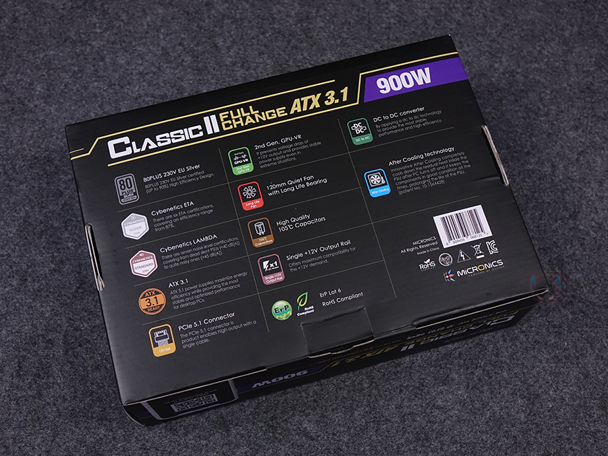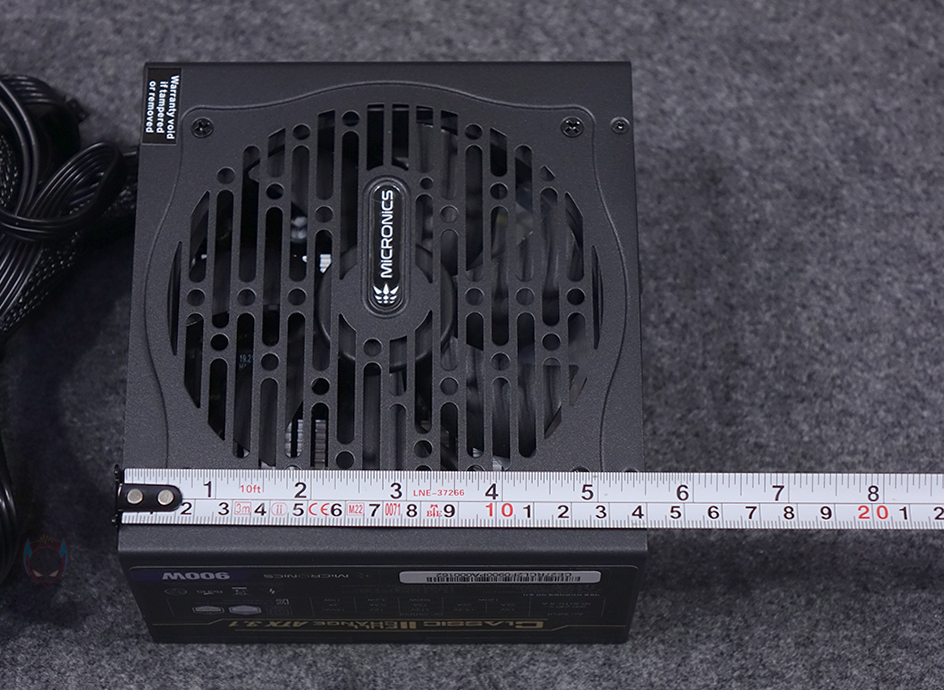 그럼, 마이크로닉스 클래식 2 풀체인지 900W 파워서플라이를 살펴보면, 색상은 올-블랙이며, 최근 파워서플라이 트렌드 중 하나인 140mm 깊이 길이를 적용해 900W 용량이지만 컴팩트한 ATX 크기를 가졌습니다. 그리고, 상단에는 화이트 모델과 마찬가지로 특정 패턴 디자인의 에어홀 처리와 함께 내부에 쿨링 역할로 120mm 팬이 장착된 것을 확인할 수 있죠. 그리고, 후면도 배기역할로 에어홀 처리를 해놨으며, 본체 한쪽 측면에는 제품명을 표기해 놨고, 반대쪽 측면에는 다시 한번 제품의 기본 사양표기를 확인할 수 있습니다.