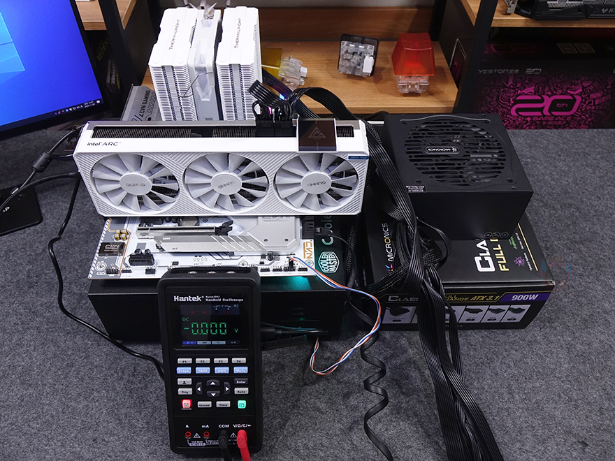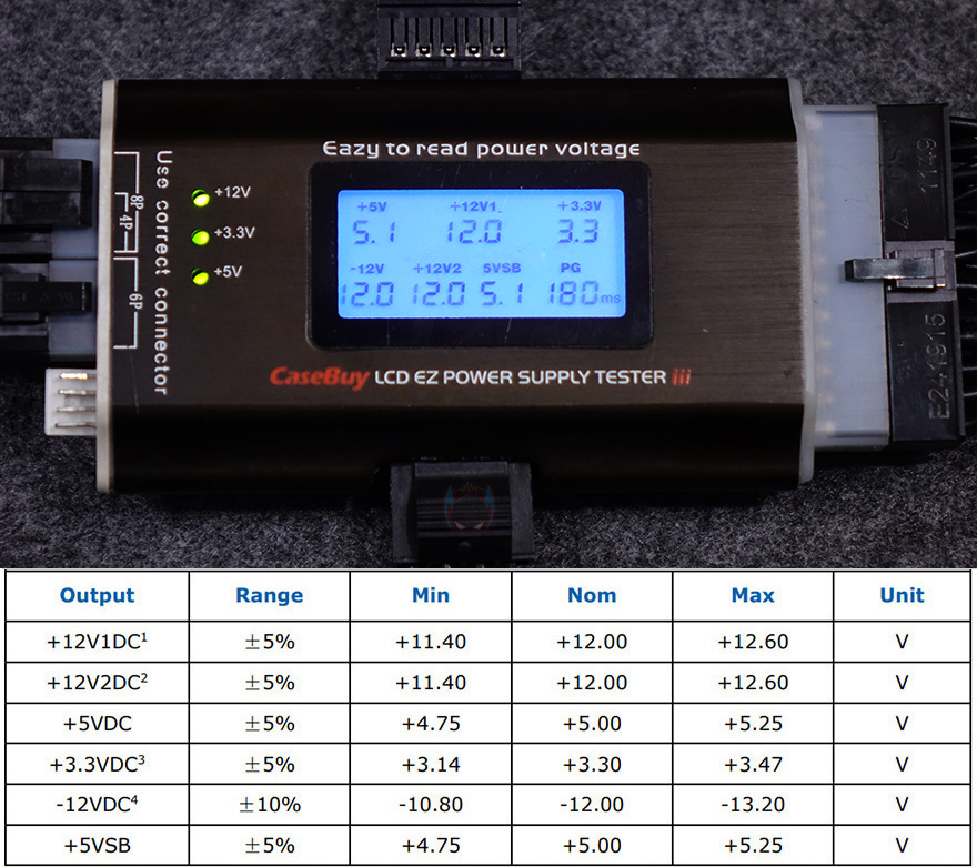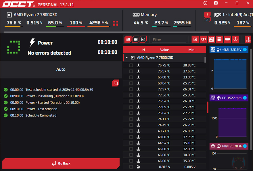 직접, 마이크로닉스 클래식 2 풀체인지 900W 파워서플라이를 사용해보면, 시스템 기반은 AMD 라이젠 7 7800X3D와 인텔 ARC 770 그래픽카드 조합으로 OCCT 프로그램을 통해 12V와 5V의 전력이 얼마나 안정적으로 출력되는지 확인 볼 텐데, 그전에 기본 작동에서 출력되는 전압을 확인해 보면, 인텔 파워서플라이 가이드에서 제시하는 표준범위에서 정상적으로 출력되는 걸 확인할 수 있습니다. 그리고, 앞서 팬에서 언급했듯이 클래식 2 풀체인지 제품들은 일정온도(50℃)에 도달하기 전까지는 팬이 작동하지 않는 제로팬 기술이 적용되어 PC를 부팅했을 때 초반에는 무소음으로 작동됩니다.
