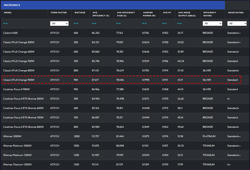 시작에서 언급했듯이 마이크로닉스 클래식 2 풀체인지 900W 파워서플라이는 블랙색상에서 단독으로 출시된 모델입니다. 이전 ATX 3.0 규격까지만 해도 600/700/800W 3가지 용량으로만 출시되다가, 이번에 ATX 3.1 규격으로 업그레이드되면서 첫 900W 용량이 나왔는데, 그것도 풀체인지 모델에선 처음으로 80 Plus 실버등급을 받아서 나왔죠. 한마디로 현재까지 나온 클래식 2 풀체인지 모델중에서는 가장 좋은 전력효율을 가지고 있습니다. 클래식 2 풀체인지는 케이블이 기본 연결된 일반 버전으로 소비자가 좀 더 가격부담을 줄이고 다가갈 수 있는 마이크로닉스의 대표 컴퓨터파워 제품 중 하나입니다. 여기에 900W 모델에서도 칼전압 수준의 안정적인 전력 공급과 무소음의 제로팬 모드와 사용후 발열을 해결해주는 애프터쿨링기술까지 적용되어 있어서 품질면에서도 만족스러운 모습을 보여줍니다. 일명 국민파워로 불리는 파워서플라이 제품에서 80Plus 실버등급에 대용량까지 바랬다면, ATX 3.1 규격으로 돌아온 마이크로닉스 클래시 2 풀체인지 900W 제품을 추천합니다.