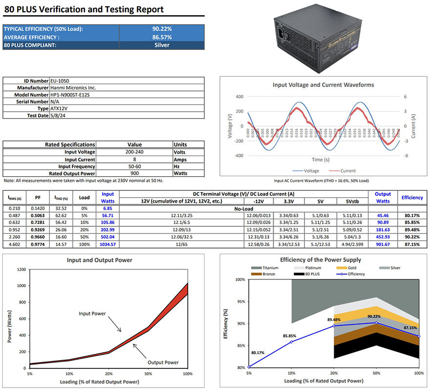 끝으로, 클래식 2 풀체인지 900W 파워서플라이는 앞서 제품 박스 주요 특징 표기에서 확인했듯이 전력효율 등급으로 80Plus와 사이버네틱스 인증을 받았습니다. 80 Plus에선 클래식 2 풀체인지 모델로는 처음 실버등급을 받았는데, 80 Plus에서 측정한 결과를 참고하면 50% Load에서 90.22%의 효율을 지니고 있으며, 새롭게 각광받고 있는 사이버네틱스(Cybenetics)에선 앞서 만났던 클래식 2 풀체인지 800W와 함께 실버 등급을 받았으며, 팬 소음은 스탠다드 등급입니다. 용량이 커짐에 따라 전력효율 역시 더 잘 관리할 수 있도록 갖춘 거죠.