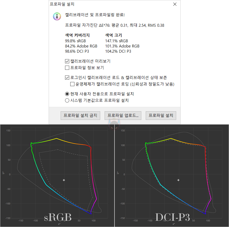 이번엔 Z18K 모니터의 색재현율을 측정해봤는데, 측정결과 sRGB는 스펙상에서 확인한 100% 오차범위 내 근접한 99.8%를 확인할 수 있습니다. 그리고, 스펙상으로 표기는 되어있지 않지만, DCI-P3 같은 경우에도 98.6%의 색재현율을 확인할 수 있었습니다. 참고로, 스펙상으로는 DCI-P3 표기가 빠져있지만, 제우스랩 알리익스프레스 공식스토어 제품 상세정보에는 DCI-P3 99%를 언급하고 있기 때문에, 역시 근접한 결과라 할 수 있죠. 특히, 비슷한 사양의 16인치 P16K 모델에선 DCI-P3 색재현율이 79% 정도였는데, Z18K에선 거의 100% 지원이라 이미지와 영상용 둘 다 사용하기에 더 좋아졌다 할 수 있습니다.