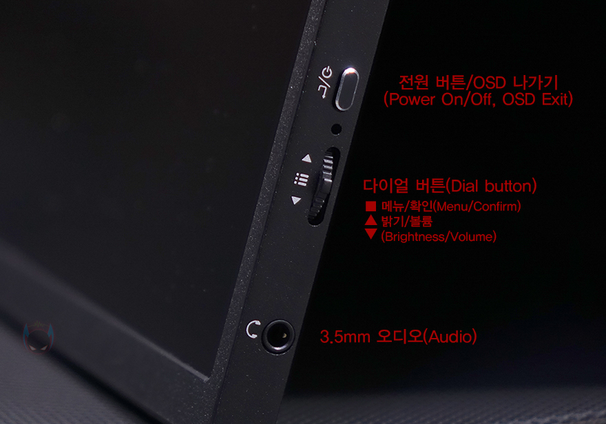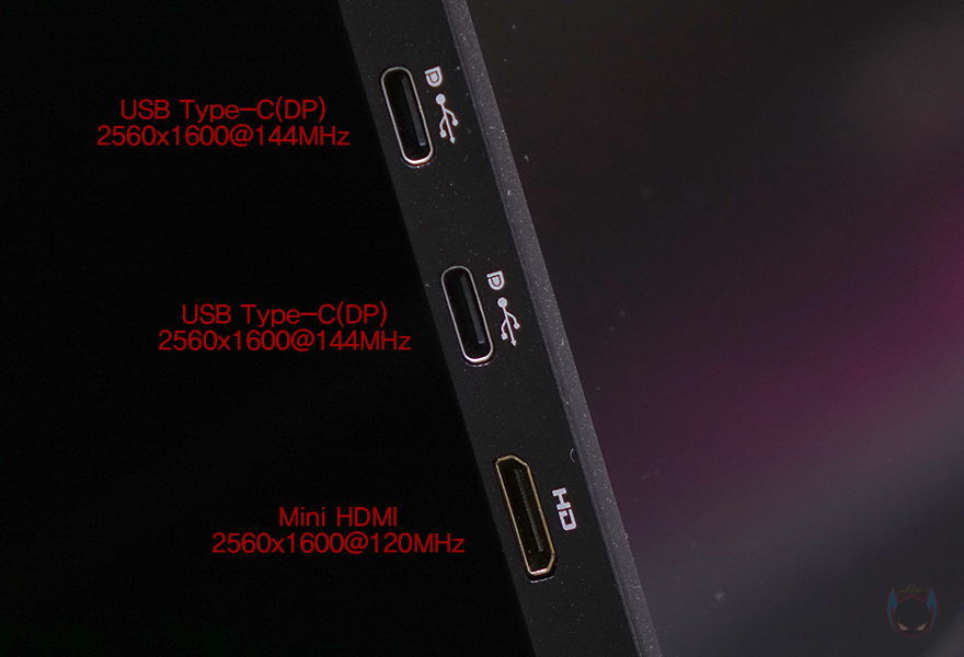 모니터 양쪽 측면 중앙위치에는 각각 1W 출력의 듀얼 스피커(Dual speaker)가 적용되어 있으며, 전면 기준 오른쪽 측면 아래에는 전원버튼(Power button)을 비롯해 다이얼 버튼(Dial button), 3.5mm 오디오(Audio) 포트가 배치되어 있죠. 참고로, 전원 버튼은 OSD 메뉴를 사용할 때 나가기(Exit) 기능으로도 사용되며, 다이얼 버튼 같은 경우에는 OSD 메뉴의 확인 및 밝기와 볼륨조절로 사용됩니다. 그리고, 반대쪽인 왼쪽 측면에는 3개의 입력포트가 있는데, 2개의 USB Type-C 포트, 1개의 미니 HDMI(Mini-HDMI) 포트죠. 뒤에서 확인하겠지만, 3개의 포트 모두 최대 해상도 2560x1600를 지원하며, USB Type-C로 사용할 때는 144Hz 주사율, 미니 HDMI로 사용할 때는 120Hz 주사율까지 지원합니다. 물론, USB Type-C 포트는 전원케이블과도 연결됩니다. 그리고, 모니터 후면에는 75x75mm 규격의 베사홀이 있어 별도의 모니터 받침대나 모니터 암에 장착할 수 있으며, 한쪽 모서리 부근에는 제품의 모델명과 소비전력 표기를 확인할 수 있죠.