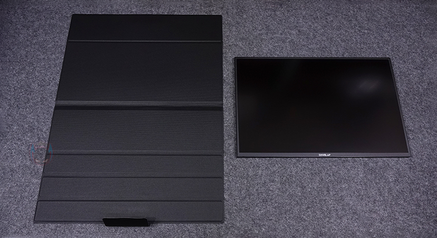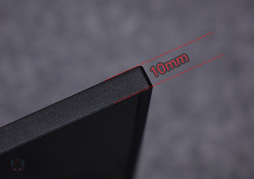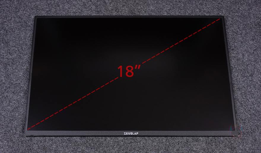 그럼, 보호케이스를 분리한 상태에서 제우스랩(Zeuslap) Z18K 포터블 모니터를 좀 더 자세히 살펴보면, 크기는 시작에서 언급했듯이 18인치(inch)를 가졌습니다. 모니터의 전체 면적은 400x258mm입니다. 그리고, 빛 반사가 적은 안티글레어를 적용하고 있으며, 패널을 보호하고 있는 테두리 베젤 같은 경우에는 윗부분과 좌우는 6mm씩, 아랫부분의 베젤은 10mm 폭을 가졌습니다. 동일한 크기의 경쟁사 제품들 중에는 아랫부분 베젤을 더 크게 갖추는 경우가 있어서 화면이 좁은 느낌이 드는 경우가 있는데, Z18K는 일반 모니터의 베젤 비율처럼 적용해 18인치 크기로 느껴집니다. 그리고, 아랫부분 베젤 중앙에는 ZEUSLAP 로고(logo)를 새겨놨으며, 측면에서 봤을 때 두께도 10mm로 슬림하죠.
