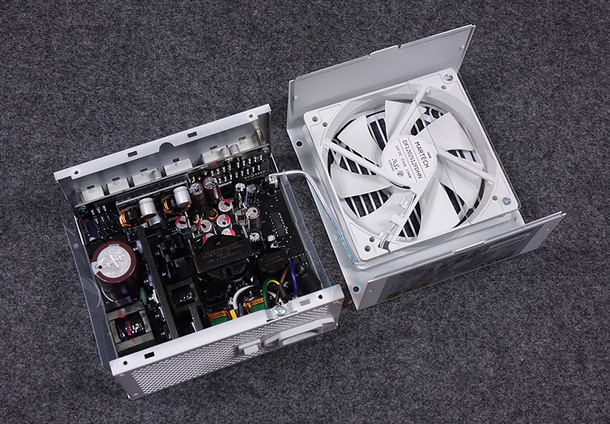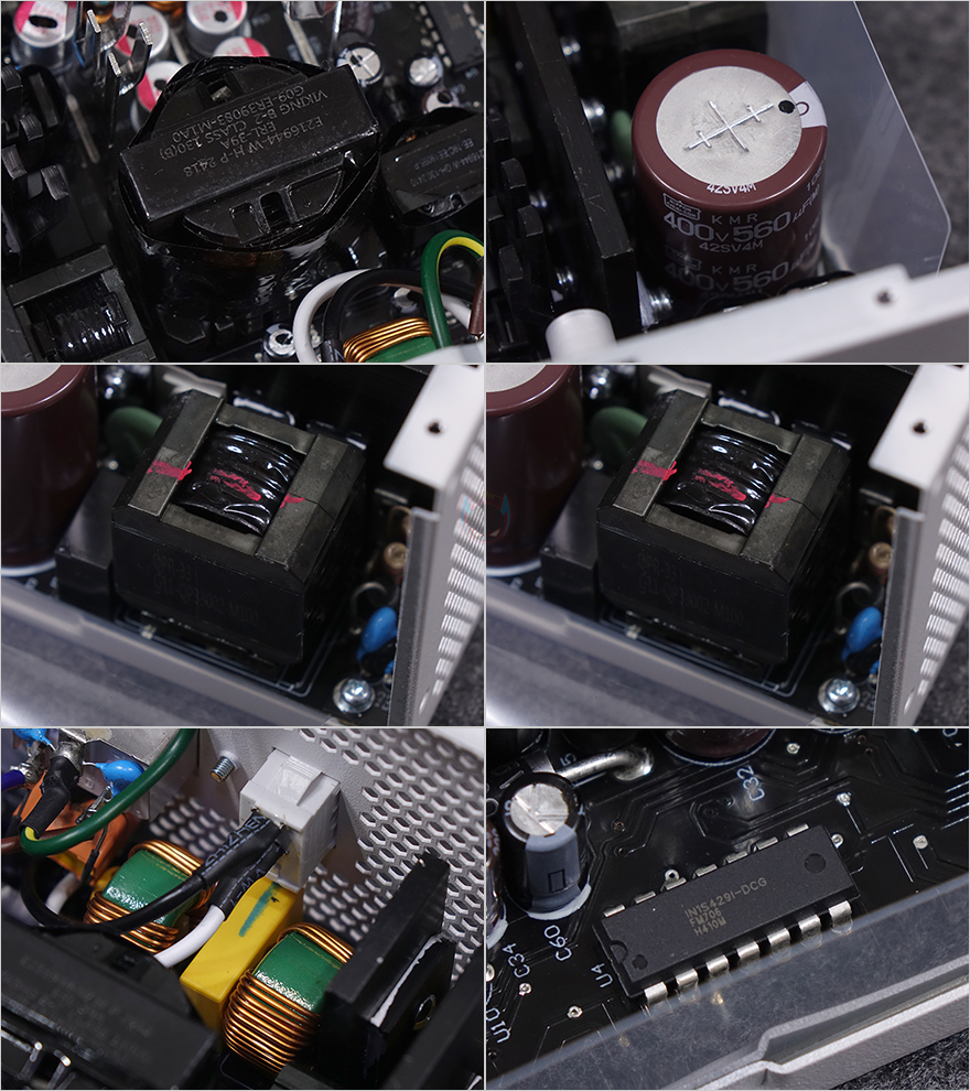 SKULL 850XM 파워서플라이의 내부를 잠깐 살펴보면, 내부에 장착된 120mm 화이트 팬은 다른 파워서플라이 제품에서도 많이 사용되는 MARTECH사 제품이며, 공기흐름 유지를 위해 에어가이드도 함께 적용되어 있습니다. 육안으로 확인할 수 있는 내부에는 안정적인 전력공급을 위한 메인트랜스포머를 비롯해, 400V/560㎌ 용량의 일본산 메인콘덴서, Actice PFC, DC to DC 컨버터, 고주파음 최소화를 위한 EMI 필터, 전력관리 IC칩 등을 확인할 수 있습니다.