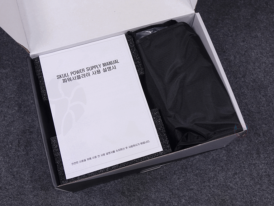 박스를 열어보면, 외부 충격방지를 위해 파워서플라이 본체는 비닐 포장과 함께 우레탄-폼에 포장되어 있으며, 뒤에서 확인하겠지만, 풀-모듈러 방식이라 나머지 케이블 및 구성품은 별도의 파우치 가방에 포장되어 있습니다. 그래서, 개봉 시 제품 구성은 크게 SKULL 850XM 파워서플라이 본체와 케이블 및 구성품이 담긴 파우치, 제품설명서를 먼저 확인할 수 있고, 파우치를 열어보면, 따로 비닐 포장처리된 모듈러 케이블들, 장착에 사용되는 나사와 전원케이블을 확인할 수 있죠. 특히, 전원케이블도 제품 색상에 맞춰서 적용한 게 인상적입니다.