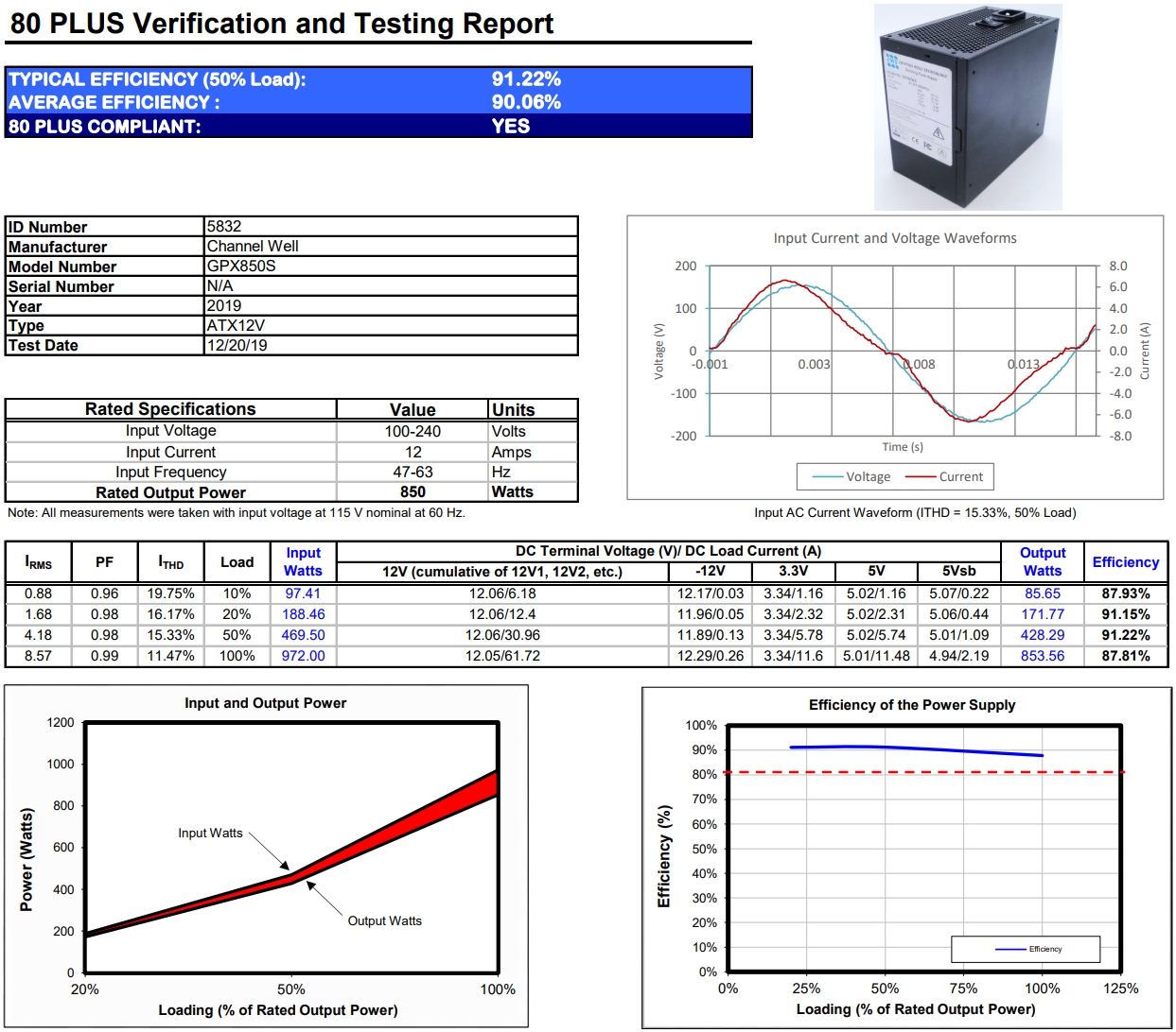 그리고, 작년부터 출시한 SKULL 시리즈 파워서플라이는 80 Plus 골드등급 인증을 유지하는데, SKULL 850XM 역시 80플러스 골드등급 인증으로 실제 80플러스 사이트에 등록된 해당 모델의 전력효율 결과값을 확인해 보면, 50% Load시 91.22%의 전력효율을 가지고 있음을 확인할 수 있습니다. 끝으로, 기본작동상태에서 팬 소음을 바로 근접해서 측정해 보면 약 48dB(A) 수준으로 정숙한 편임을 확인할 수 있으며, 실제 PC케이스에 내장되면 사용자와의 거리가 더 멀어지기 때문에 더 조용하게 들리게 됩니다. 즉, 해당 제품으로 인한 소음 불편은 없다고 볼 수 있습니다.