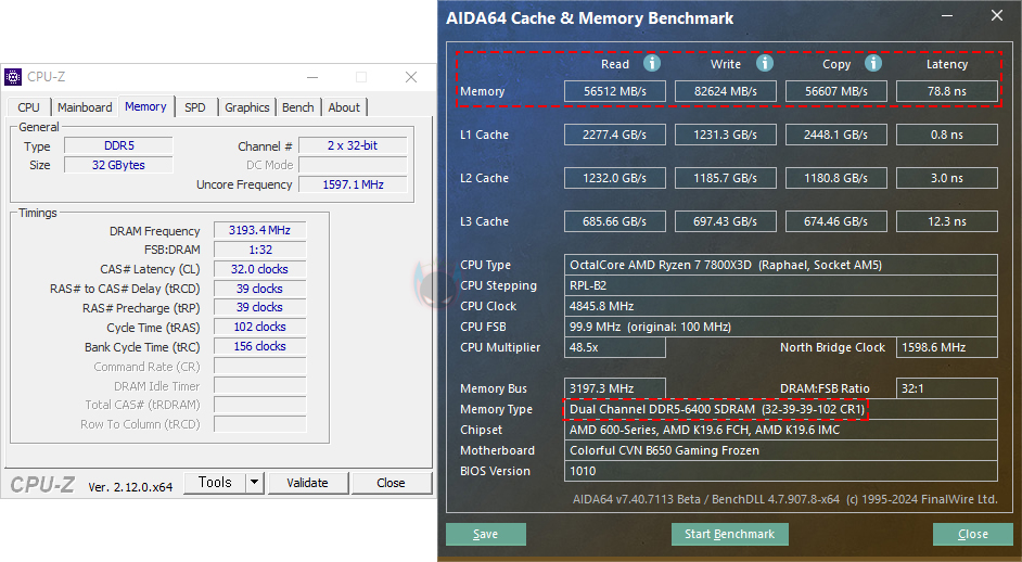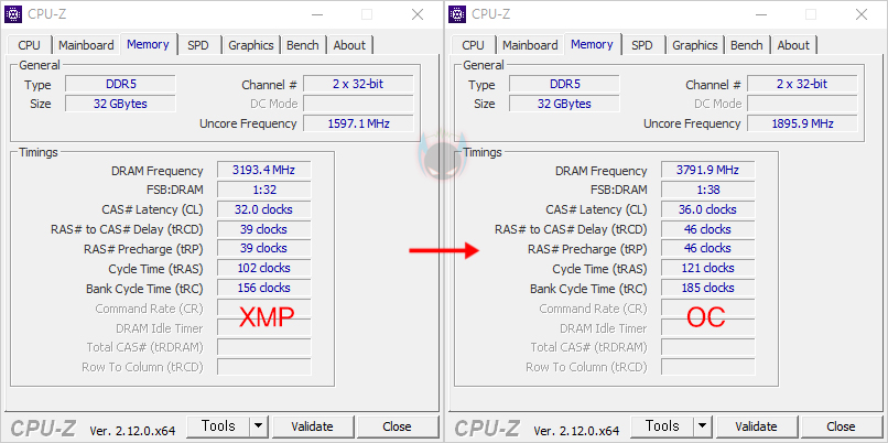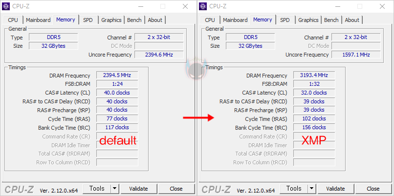 직접, 실리콘파워(SiliconPower) STORM RGB DDR5 메모리를 사용해보면, 일단 메인보드에 장착해서 전원이 켜지면 바로, 기본 RGB 모드의 라이트닝 효과를 확인할 수 있습니다. 그리고, 앞서 언급했듯이 메인보드 RGB Sync를 지원하기 때문에, 사용하는 메인보드에서 RGB Sync 프로그램이 있다면, 연동되어 더 다양한 RGB 모드로 전환할 수 있죠. 리뷰에 사용된 모델은 6400 MHz XMP 프로파일이 적용된 모델로 CPU-Z 프로그램을 통해 확인할 수 있으며, 기본작동클럭은 4800 MHz입니다. 그래서, 메인보드에 바이오스 CMOS에서 XMP 프로파일값을 불러오면 쉽게 6400 MHz으로 오버클럭 적용할 수 있죠.