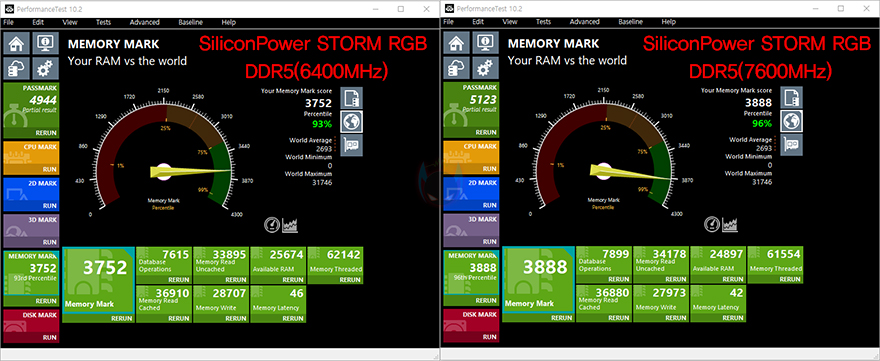끝으로, 실리콘파워 STORM RGB DDR5 메모리는 XMP 프로파일이 적용된 제품들로만 출시를 했는데, 최소 6000MHz 클럭부터 최대 8000 MHz 클럭까지 다양하게 출시되었습니다. 특히, 6400~7600 MHz까지는 1.4V 전압으로 모두 적용되었죠. 그래서, 리뷰에 사용된 6000 MHz 모델 같은 경우 동일한 1.4V 전압에서 7600 MHz 모델과 같은 램 타이밍 값으로 설정해 수동 오버클럭을 시도해 봤습니다. 결과는 쉽게 7600 MHz까지 클럭을 더 높일 수 있었고, 6400 MHz 클럭 때보다 좀 더 나은 성능 향상도 확인할 수 있었죠. 1.4V의 7600 MHz 클럭까지 적용되었으면, 최소 메모리 모듈이 하이닉스 A다이가 적용되었다고 짐작할 수 있어서, CPU와 메인보드만 받쳐주면 더 높은 오버클럭도 시도해 볼 수 있겠습니다.