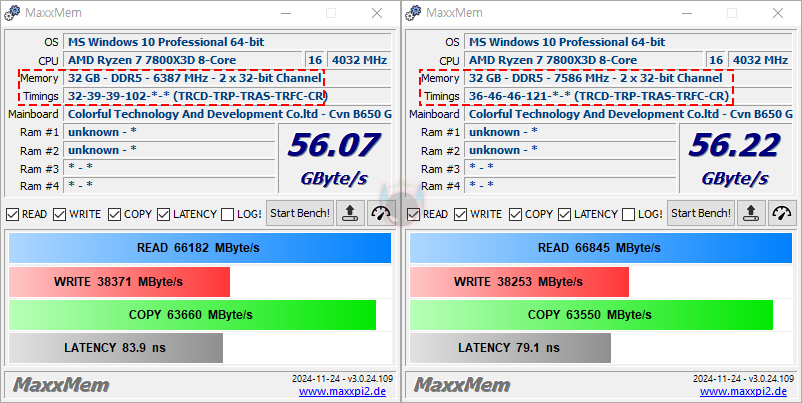 그럼, 기본작동 클럭인 4800MHz와 XMP 프로파일의 설정값 6400 MHz 클럭으로 STORM RGB DDR5 메모리의 성능을 비교해 보면, AIDA64 Cache&Memory Benchmark, MaxxMEM, Novabench Memory Test, Passmark PerformanceTest Memory Mark까지 메모리 위주의 벤치마크 프로그램들로 실행 비교해 본 결과 모두 XMP 프로파일값의 6400 MHz 클럭이 좀 더 나은 성능을 보여주는 걸 확인할 수 있습니다. 메모리 오버클럭을 할 줄 모르거나 초보자인 사용자들은 XMP 프로파일로 쉽게 성능향상을 할 수 있는 효과를 그대로 보여줍니다.
