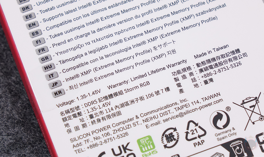 제품 패키지부터 살펴보면, STROM RGB DDR5 메모리 역시 자사의 다른 메모리 제품들과 마찬가지로 단일(Single) 패키지와 듀얼 채널(Dual channel) 패키지로 출시했습니다. 리뷰에선 각각 단일패키지로 살펴볼텐데, 제품 박스에서 확인할 수 있듯이 STROM RGB DDR5도 블랙과 화이트 2가지 색상의 방열판으로 구분되어 출시가 되었죠. 제품 이미지를 담고 있기 때문에 미리 디자인을 간접적으로 확인할 수 있으며, 추가로 용량 표기와 메인보드 RGB Sync 지원 표기도 확인할 수 있습니다. 기본적으로는 흔히 말하는 4대 메이저 메인보드의 RGB Sync를 표기를 해놨는데, 뒤에서 확인하겠지만, 꼭 이 브랜드 메인보드가 아니라도 사용하는 메인보드에서 RGB Sync를 지원하면 대부분 호환이 됩니다. 그리고, 박스 후면에는 한국어를 포함해 다국적 언어로 간략한 소개 문구를 담고 있으며, 박스를 열어보면, 메모리 외에는 다른 구성품은 없습니다.