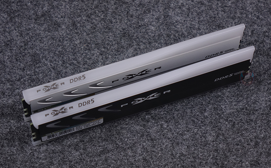 그럼, 실리콘파워(SiliconPower) STROM RGB DDR5 메모리 외형을 살펴보면, 앞서 언급했듯이 방열판 색상에 따라 블랙(Black)과 화이트(White) 2가지 색상으로 출시되었습니다. 방열판 디자인은 상단 RGB 라이트닝 효과를 볼 수 있는 LED 바를 기준으로 좌우 비대칭형 디자인이며, 방열판 중앙에 XPOWER 로고와 함께 바로 오른쪽에는 방열판 일부에서도 라이트닝 효과 노출이 되도록 디자인처리 되어있죠. 방열판을 분리하지 않아도 PCB기반이 블랙색상이라는 걸 측면에서 쉽게 확인할 수 있고, 상단 LED 바 한쪽에는 XPOWER DDR5 표기를 해놨으며, 반대쪽은 높이가 더 올라간 지느러미가 연상되는 디자인을 가졌습니다.