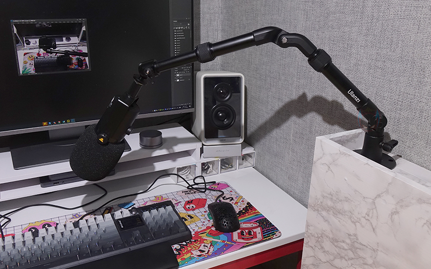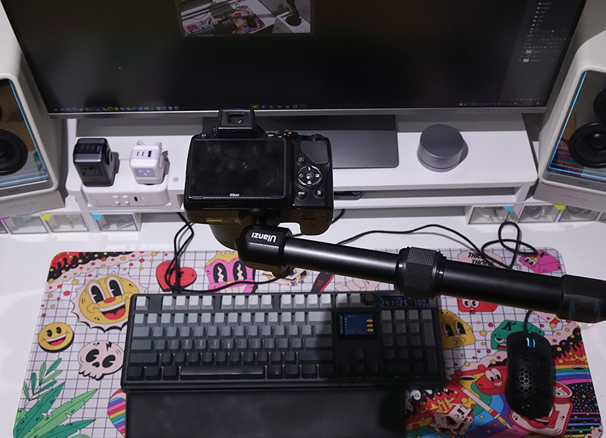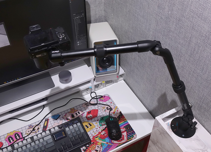 마운트에 암 막대까지 장착하면 이후부터는 사용자 원하는 구도나 각도에 맞춰서 조절을 해주면 되는데, 필자 같은경우 키보드 타이핑 영상을 자주 올리기 때문에 카메라를 항공샷 즉 수직촬영 위치에 쉽게 고정해 놓을 수 있었습니다. 특히, 최대 무게 하중 2kg까지 견디기 때문에 데스크 같은 테이블에 클램프 방식으로 고정하는 암보다 더 견고하게 유지해 줍니다. 또한, 앞서 볼헤드 부분이 1/4" 인치 볼트를 기본 갖추고 있기 때문에 경우에 따라서 마이크 붐 암처럼도 사용할 수 있습니다.
