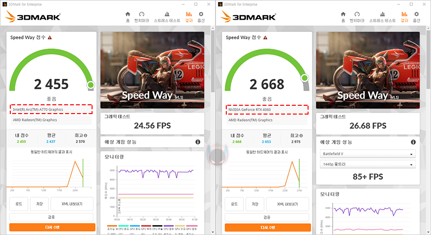 하지만, 다이렉트X 12 기반의 Time Spy에선 이야기가 달라집니다. 정반대로 GUNNIR Arc A770 Photon 16G 그래픽카드가 앞서는 결과값을 확인할 수 있죠. 특히, Fire Strike보다 결과차이가 더 큽니다. 그러나 가장 최신 기반인 다이렉트X 12 얼티메이트에 Speed Way에선 다시 지포스 RTX 4060이 2 fps정도 더 앞서는 결과를 보여주죠. 종합적으로 보면, Arc A770 Photon 16G 그래픽카드가 모든 면에서 앞설 것 같지만, 사실상 다이렉트X 12 기반에서만 강한 모습을 보여줍니다. 이는 현재 인텔의 외장형 그래픽카드 최적화가 다이렉트X 12에 초점을 두고 있다고도 해석할 수 있죠.