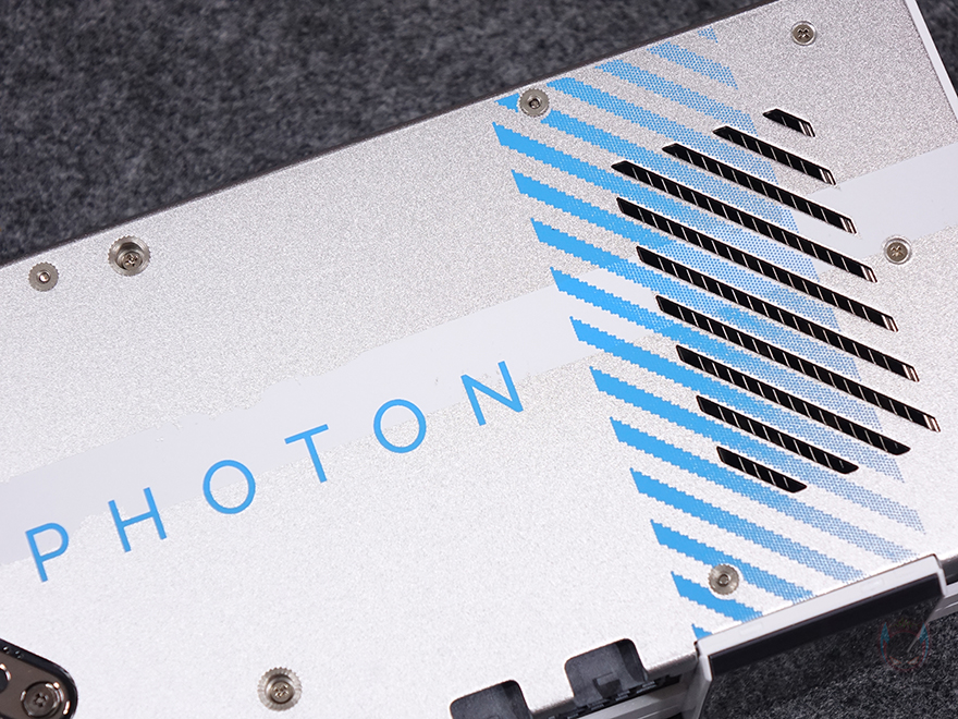 Arc A770 Photon 16G 그래픽카드 후면에는 앞서 제품박스 이미지에서 미리 확인했듯이 백플레이트(Backplate)가 기본 적용되어 있습니다. 백플레이트 디자인 역시 화이트계열에 맞춰서 메탈 재질 그래도의 실버색상으로 유지하며 심플한 디자인에 PHOTON 로고정도만 새겨놨으며, 오른쪽에는 쿨링효과를 좀 더 높일 수 있도록 일부 에어홀처리를 해놨죠. 메인보드와 연결되는 PCI 슬롯부분은 보관 시 슬롯 보호를 위해 커버가 함께 제공되며, 모니터 출력 포트들도 모두 부식 방지 및 먼지 유입 방지를 위해 커버가 제공됩니다. 출력포트는 DP 2.0 포트 3개, HDMI 2.0 포트 1개를 갖추고 있죠.