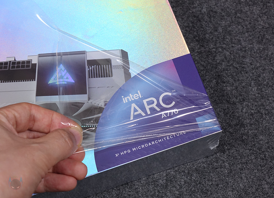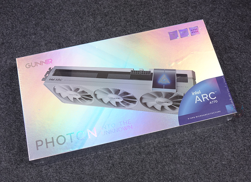 제품 패키지부터 살펴보면, 박스까지 밀봉처리된 상태로 소비자입장에선 이런 포장처리가 판매제품에 좀 더 신뢰를 가질 수 있죠. 또한, GUNNIR에서 최상급 모델인만큼 박스 디자인에도 나름 신경을 많이 썼는데, 홀로그램 효과로 배경색을 적용하면서 전면에 제품 이미지를 담고 있습니다. 뒤에서 다시 언급하겠지만, Photon 모델 같은 경우 기본 2가지 색상으로 출시가 되었으며, 제품 색상에 맞춰서 박스 디자인이 적용되었고, 리뷰에선 제품 이미지를 통해 화이트색상임을 미리 알 수 있죠. 참고로, 화이트색상 같은 경우 경쟁사들보다 심플한 느낌을 잘 살려서 출시 때부터 디자인에서는 주목을 받았습니다. 그리고, PHOTON 모델명과 함께 인텔 아크 A770 Xe HPG 아키덱처 표기와 이에 따른 게임 업스케일링 기술 Xe 슈퍼 샘플링(XeSS, Xe Super Sampling), 다이렉트X 12 얼티메이트(DirectX 12 Ultimate) 기술 지원표기를 추가로 확인할 수 있습니다.