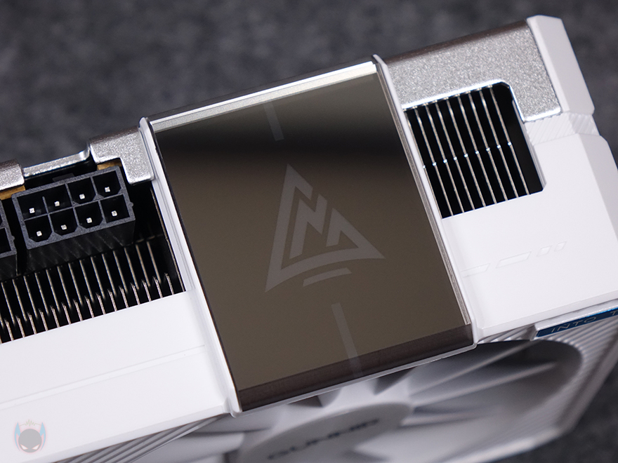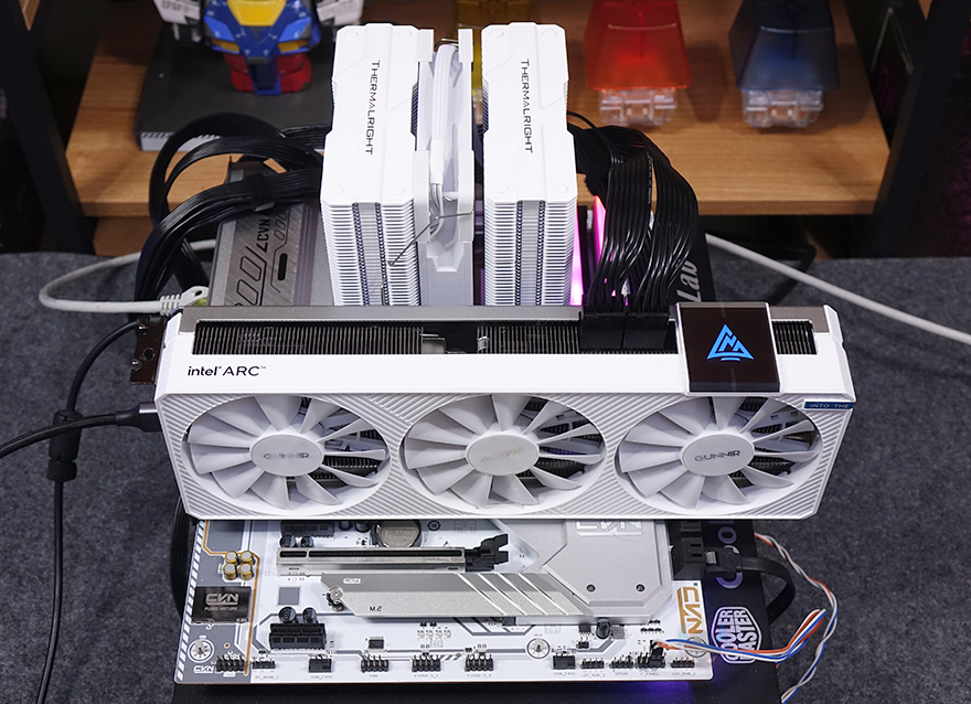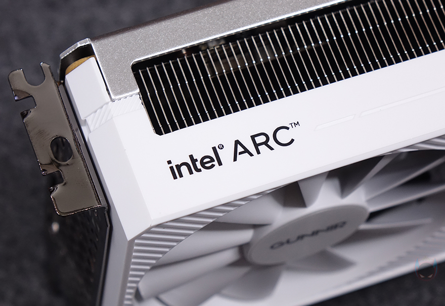 측면에서 그래픽카드를 보면, 쿨러까지 포함한 높이가 PCI 슬롯 2단보다 조금 더 높은 것을 확인할 수 있으며, 맨 오른쪽에 인텔(Intel) ARC 표기를 확인할 수 있습니다. 그리고, 오른쪽으로는 PCIe 보조전원 8핀이 2개 적용된 것을 확인할 수 있으며, 바로 왼쪽에 LED 라이트닝 효과를 보여주는 GUNNIR 로고(Logo)를 확인할 수 있는데, 참고로 이부분은 RGB 같은 효과가 아니라 전원 연결상태를 확인해 주는 LED 인디케이터 같은 역할만 합니다. 또한, 로고 부분 역시 개봉 시에는 보호비닐이 부착되어 있죠.