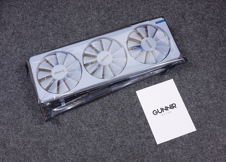 그럼, 본격적으로 GUNNIR의 Arc A770 Photon 16G 그래픽카드를 살펴보는데, 색상은 앞서 잠깐 언급했듯이 기본 화이트(White)와 블랙(Black) 2가지 색상으로 출시되었으며, 콜라보에디션으로 엘든링(Elden ring) 게임을 디자인한 제품도 있습니다. 또한, 개봉 시에는 쿨러 팬 중앙에 보호비닐이 부착되어 있으며, 그래픽카드 전체 크기는 300x128.5x50mm입니다. 쿨러에는 90mm 크기의 팬이 3개 장착되어 있으며, 팬당 11개의 날개를 가지고 있고, 최대한 심플한 디자인을 살리면서 일부 위치에 포인트를 주는 디자인을 가졌습니다.