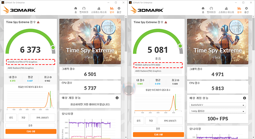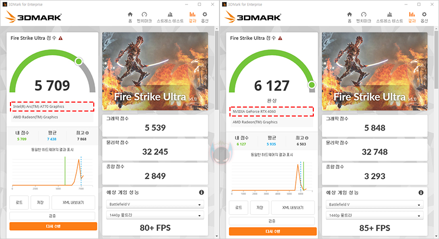 그럼, GUNNIR의 Arc A770 Photon 16G 그래픽카드 성능을 확인해보는데, 이미 국내외 미디어를 통해서 벤치마크 성능은 많이 공개된 상태라 필자 역시 직접 직구로 구입한 제품인 점을 고려해, 간략하게 3DMark로만 비교를 했으며, 비교 모델은 지포스 RTX 4060입니다. 일단, 다이렉트X 11 기반의 Fire Strike에서 기본 옵션부터 익스트림, 울트라까지 모든 결과값이 지포스 RTX 4060이 조금 더 앞서는 모습을 보여줍니다. 프레임으로 따지면 5 fps정도 차이나죠.