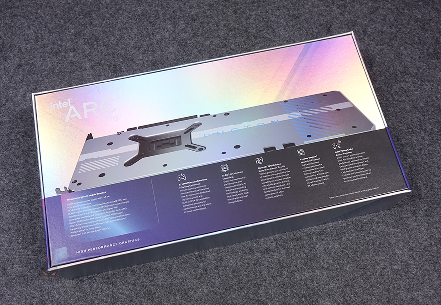 박스 후면에는 제품 실물의 후면 이미지를 담으면서 역시 인텔의 기술 지원표기를 해놨는데, 이미지를 해당 그래픽카드에 백플레이트가 적용되었다라는걸 미리 알 수 있습니다. 그리고, 방금 언급했던 Xe HPG 아키텍처, XeSS, 다이렉트X 12 얼티메이트 기술 지원 외에 AV1 인코딩 지원, 인텔 CPU와 함께 사용했을 시 사용할 수 있는 딥-링크(Deep Link) 지원 표기를 확인할 수 있죠.